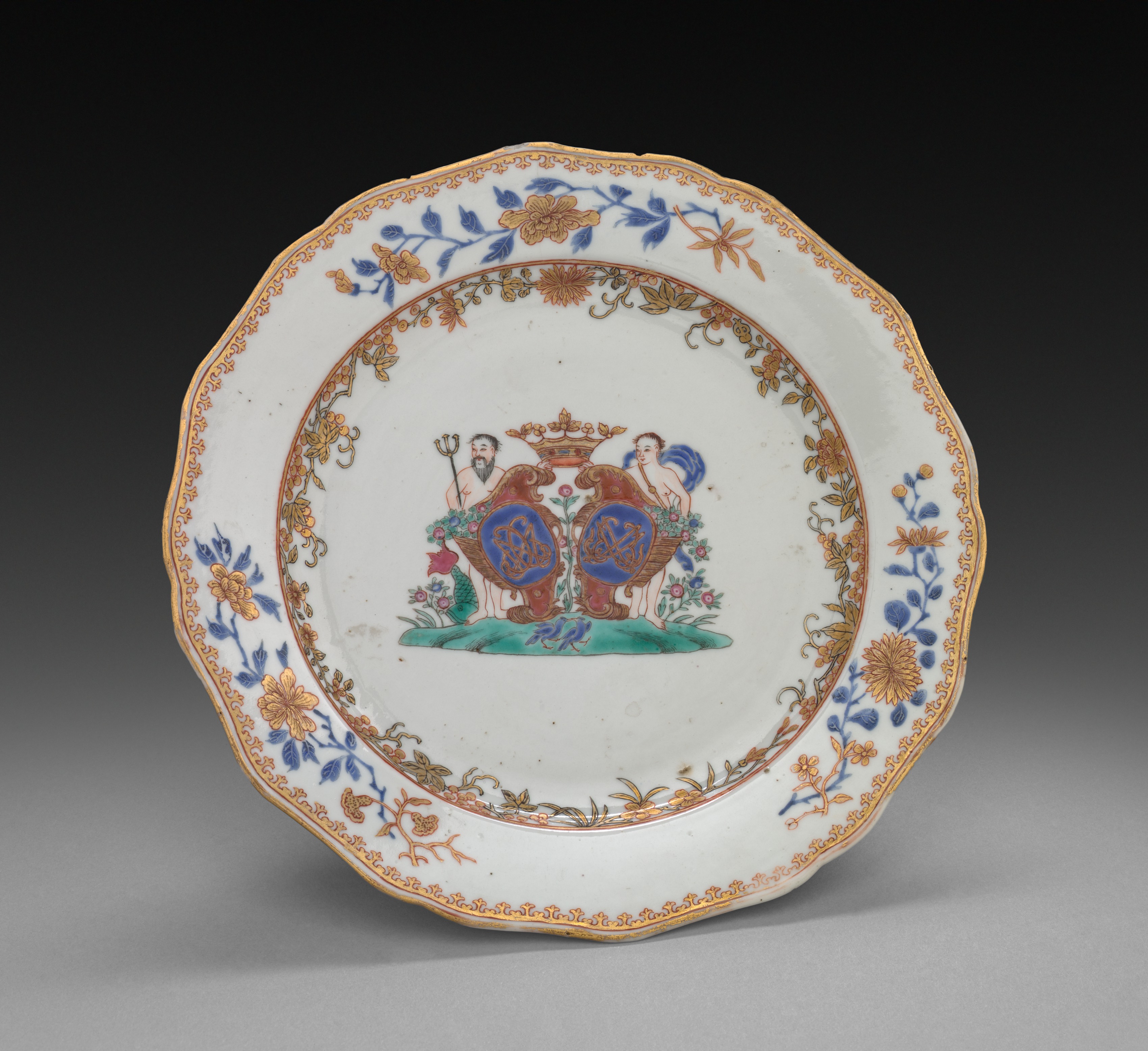 White dinner plate with scalloped edges. The plate has a central design featuring a man and woman on either side of a decorative object. The man on the left has a beard and holds a trident. The woman on the right has a blue feather or fan. Both figures are surrounded by flowers and foliage on green ground. The central design is surrounded by a gold and blue floral border. The outer rim of the plate features a blue and gold floral pattern. The plate has a gold rim. The background of the image is dark at the top and light at the bottom.