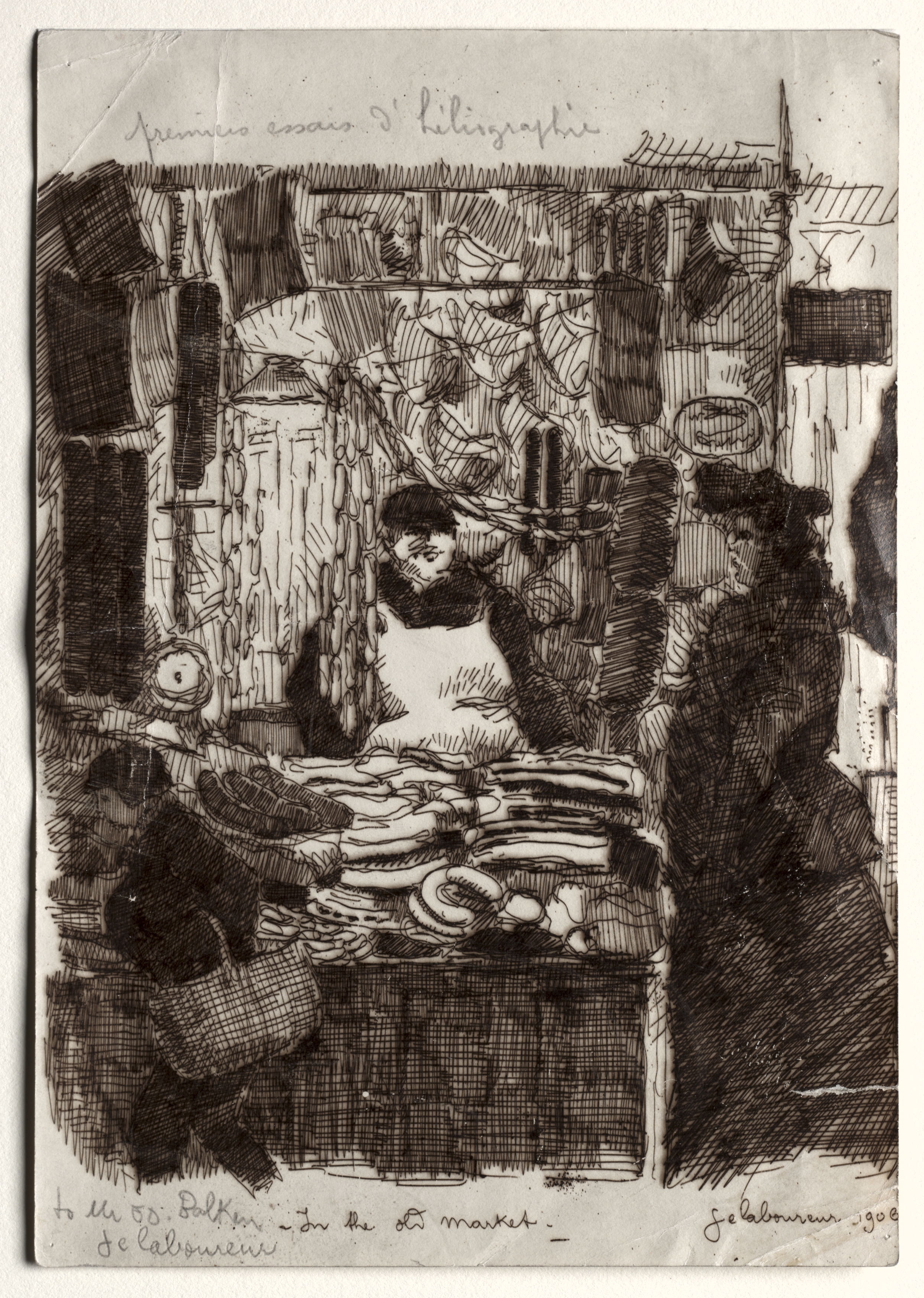Black and white image of a market scene. A man and woman are standing facing each other. The woman has dark hair and a white shirt. The man is wearing a dark jacket and hat. There are baskets and various goods on and around a table between them. The woman's hands are on the table. The man has his arms crossed. There are hanging objects in the background. The image is a sketch with many lines. The image is titled 'In the Old Market' by Jean-Émile Laboureur.