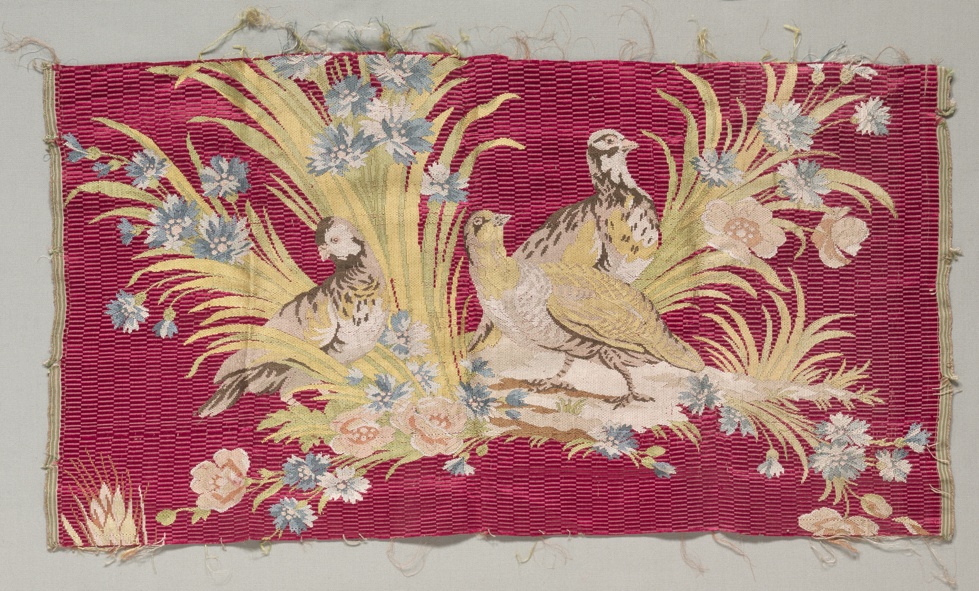 Red fabric with a woven design of two birds, surrounded by flowers and foliage. The fabric has frayed edges and appears to be a silk fragment. The woven design features a red background with yellow, blue, and white flowers and leaves. The two birds are positioned in the center, one on the left and one on the right, with their bodies facing each other. The bird on the left has brown and white feathers, while the bird on the right has yellow and white feathers. The overall design is intricate and detailed, with a mix of natural colors and textures.