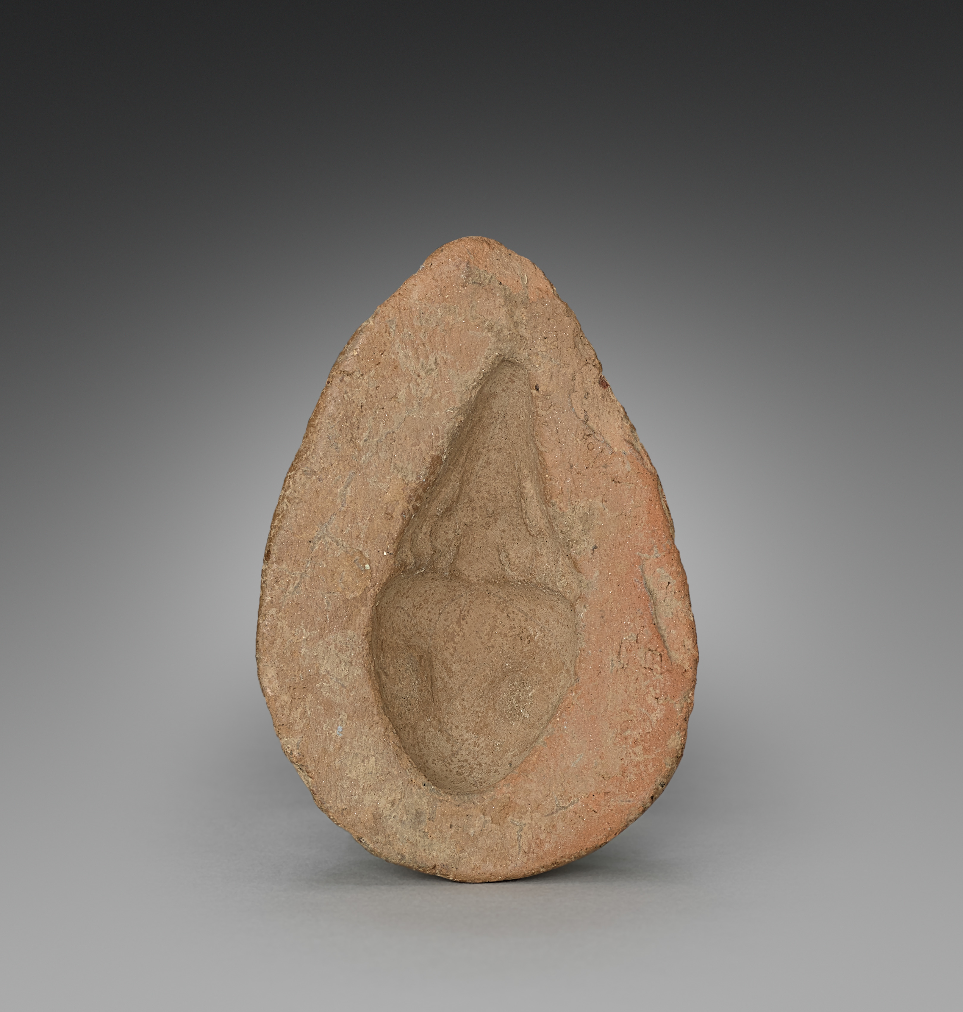 The image depicts a terracotta mould with a teardrop shape. The mould has a light-brown color with some darker brown and reddish hues. A smaller teardrop shape is indented in the centre of the mould. The background is a gradient from dark grey at the top to light grey at the bottom. The mould sits on a light grey surface. The artist of the mould is unknown but the title is "Mould".