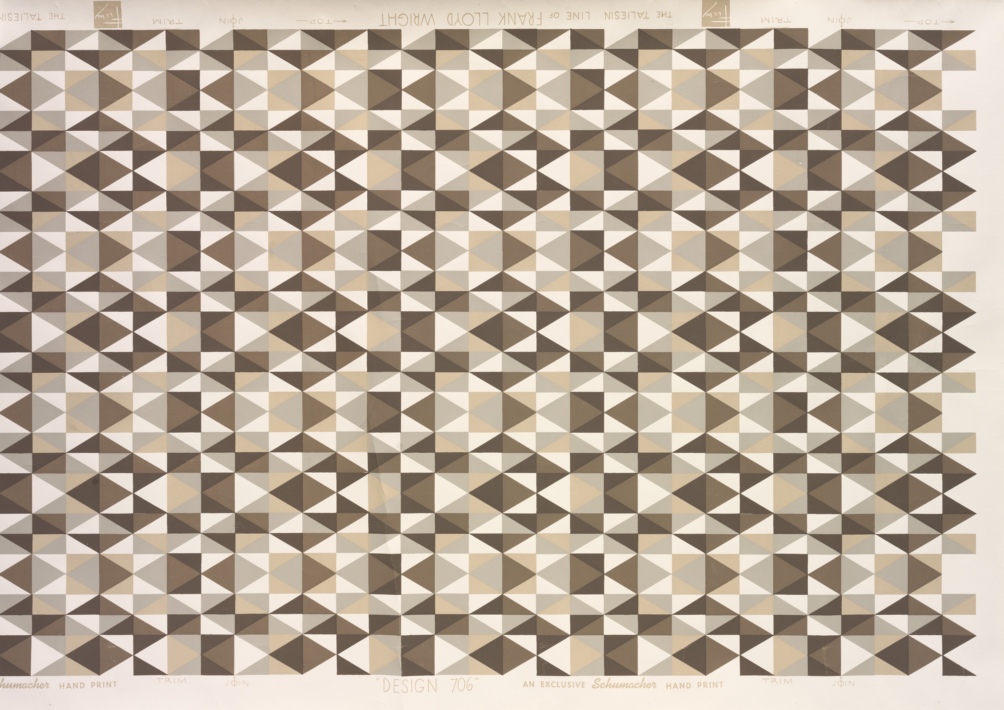 The image shows a geometric pattern composed of triangles in shades of brown, beige, and white. The triangles are arranged in rows and columns, with each triangle pointing in different directions to form a larger design. The background of the image is beige with brown text. Along the bottom and top edges of the image, the text reads 'HAND PRINT', 'TRIM', 'JOIN', 'DESIGN 706', 'AN EXCLUSIVE Schumacher HAND PRINT', 'THE TALIESIN LINE OF FABRICS', and 'FRANK LLOYD WRIGHT'. The design consists of small equilateral triangles in various shades of brown, beige, and white. The triangles are arranged in a repeating pattern. The overall effect is one of intricate detail and visual interest. The artist of the image is F. Schumacher and Co.