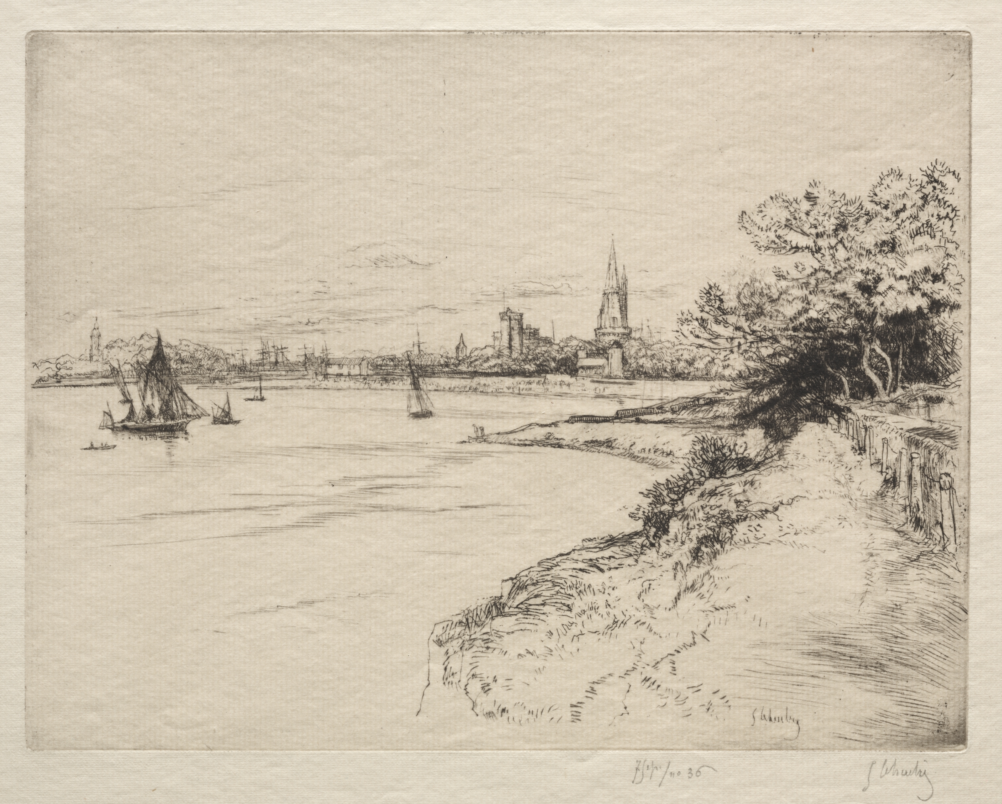 La Falaise d'Orbigny by Gustave Leheutre: A black and white sketch depicting a coastal scene. A cliffside with a wooden fence and a tree on the right side slopes down to a body of water. A small boat and several sailboats are on the water. A town or city with several buildings, including one with a tall steeple, is in the background. The sky appears cloudy. The artwork is signed and numbered at the bottom.