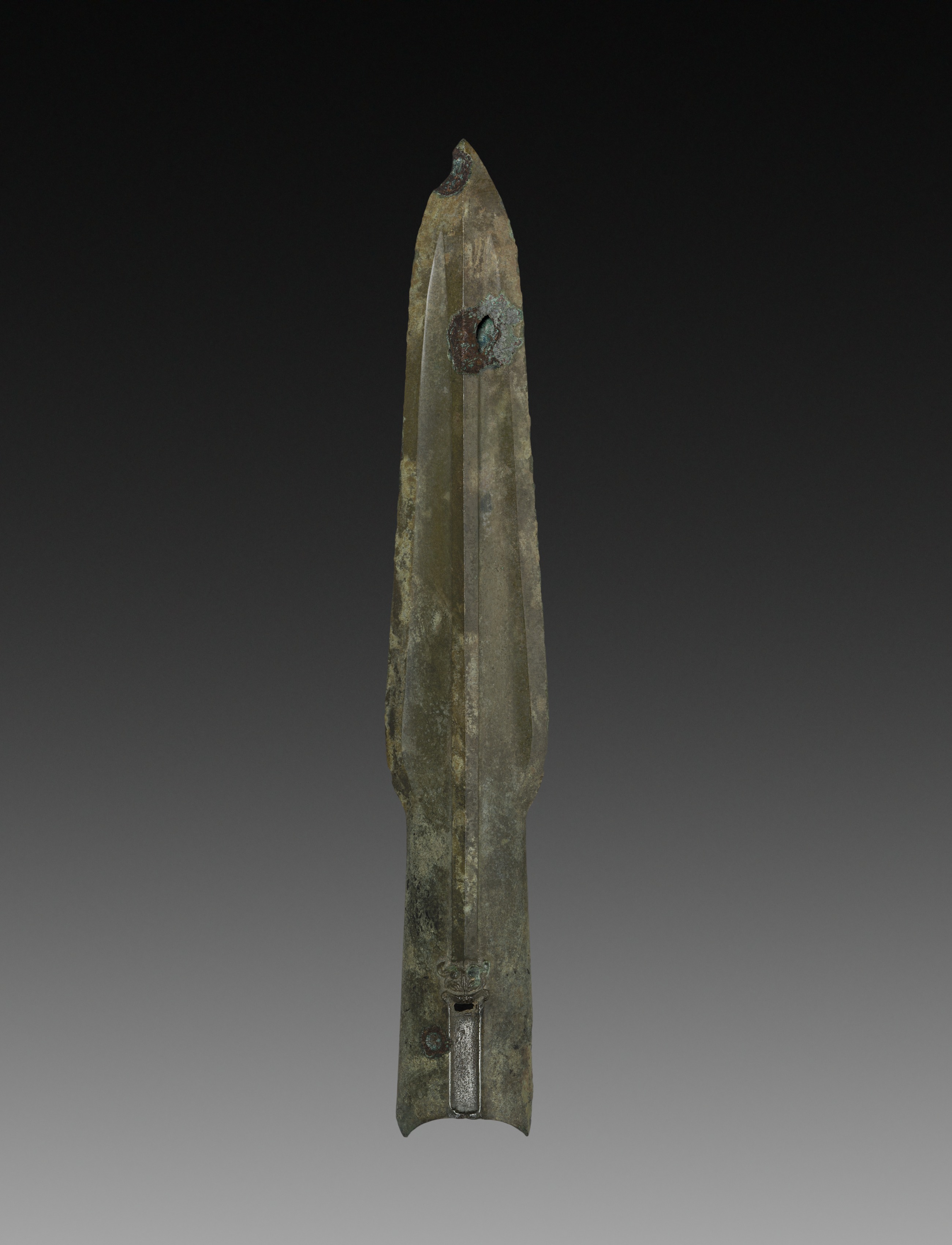 The image shows a tall, narrow, pointed metal spear point with a long groove. The spear point is made of a weathered greenish-gray metal. A small loop is on the right side near the top. The base of the spear point is wide and flat with a small rectangular section sticking out. The background is dark at the top and lightens to gray towards the bottom. The image is of the art piece titled "Spear Point".