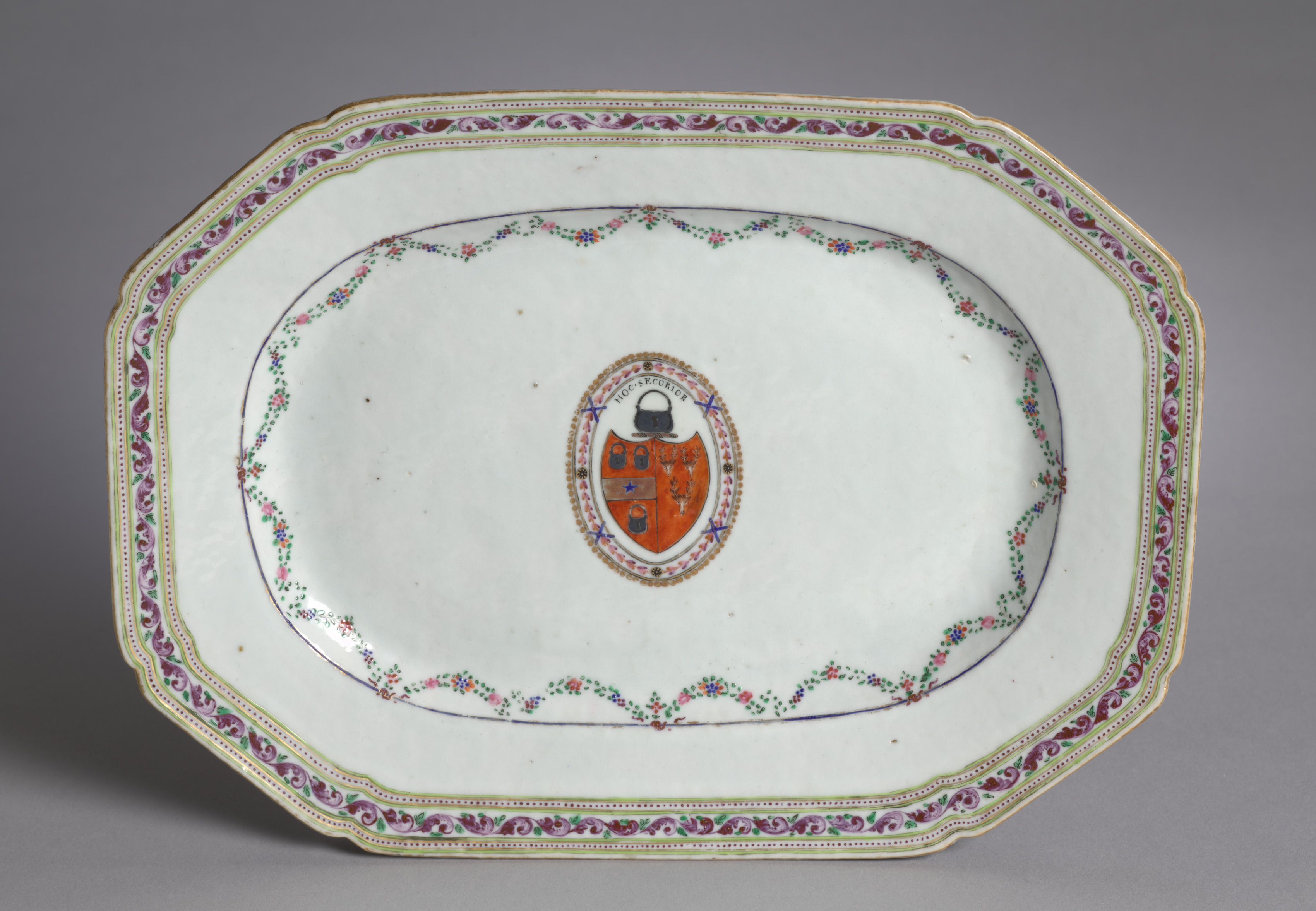 White, elongated, octagonal platter with scalloped edges. The platter has a purple, green, and pink design around the border. Inside the border, a thin purple line curves around the inside edge. Inside that line, a floral design in pink, green, and blue. In the center, an oval design with a red shield. The shield contains a black object and a dark cross. The oval design around the shield is white with a gold border and illegible black text. The platter is titled "Platter" and is by an unknown artist.