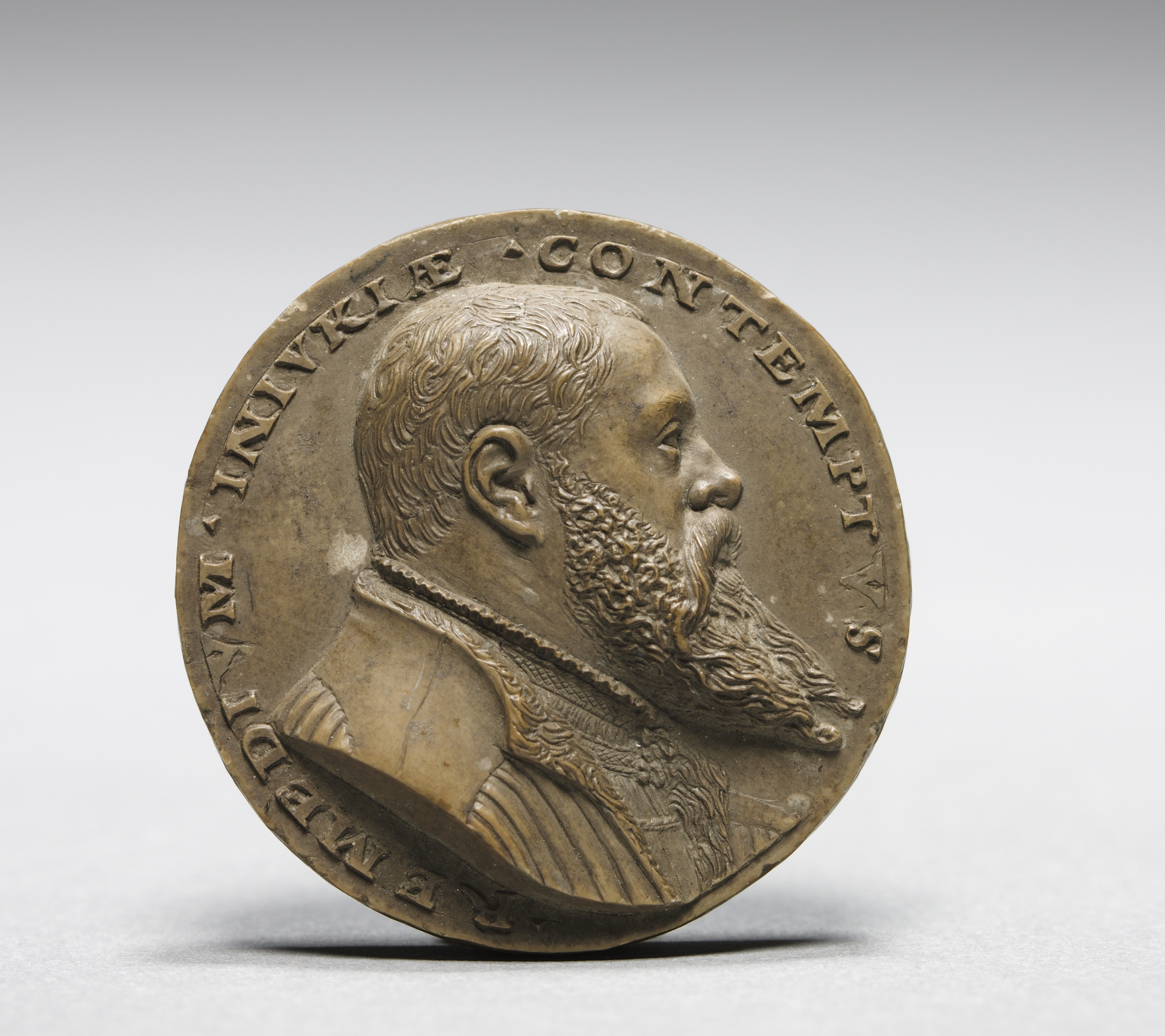Bronze medal with a profile view of a man with short hair and a beard, facing right. The man has a ruffled collar and a decorative top. The medal has an inscription around the top edge that reads "INVICIE CON TEMPTAS" and another inscription along the bottom edge. The medal is standing on its edge, with a slight shadow underneath. The background is a gradient of gray and white.