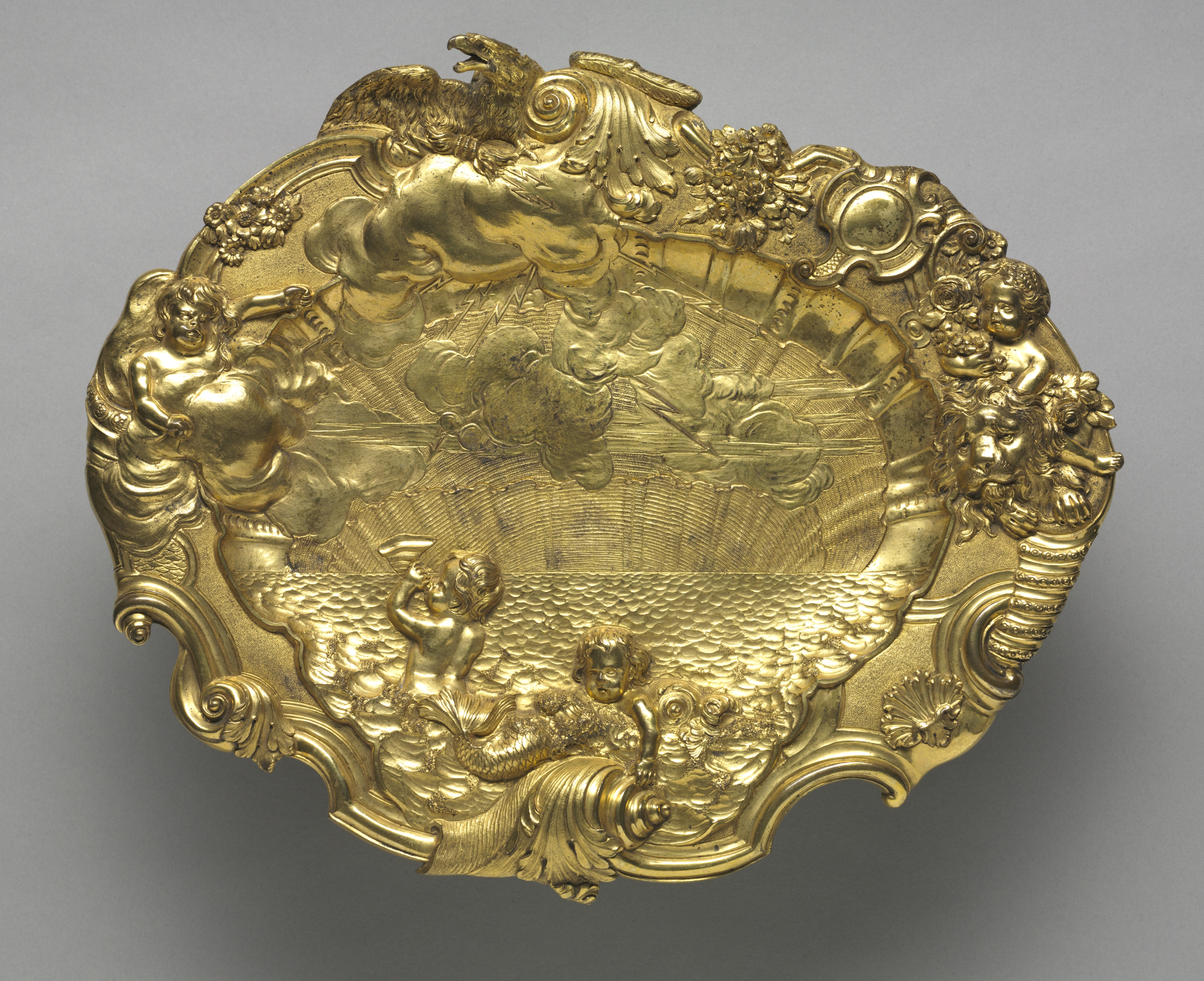 The image shows a gold-colored, ornate plate titled "Basin" by an unknown artist. The plate is round with a raised edge. The edge is decorated with a variety of figures and designs, including a bird at the top, two cherubs on the right side, and a man and a woman on the left side. The basin's interior features a textured, fish-scale pattern on the bottom and a scene of people in a boat on the water. The plate has a shiny, reflective surface and appears to be made of metal, possibly gold or brass. The background of the image is a plain gray color.