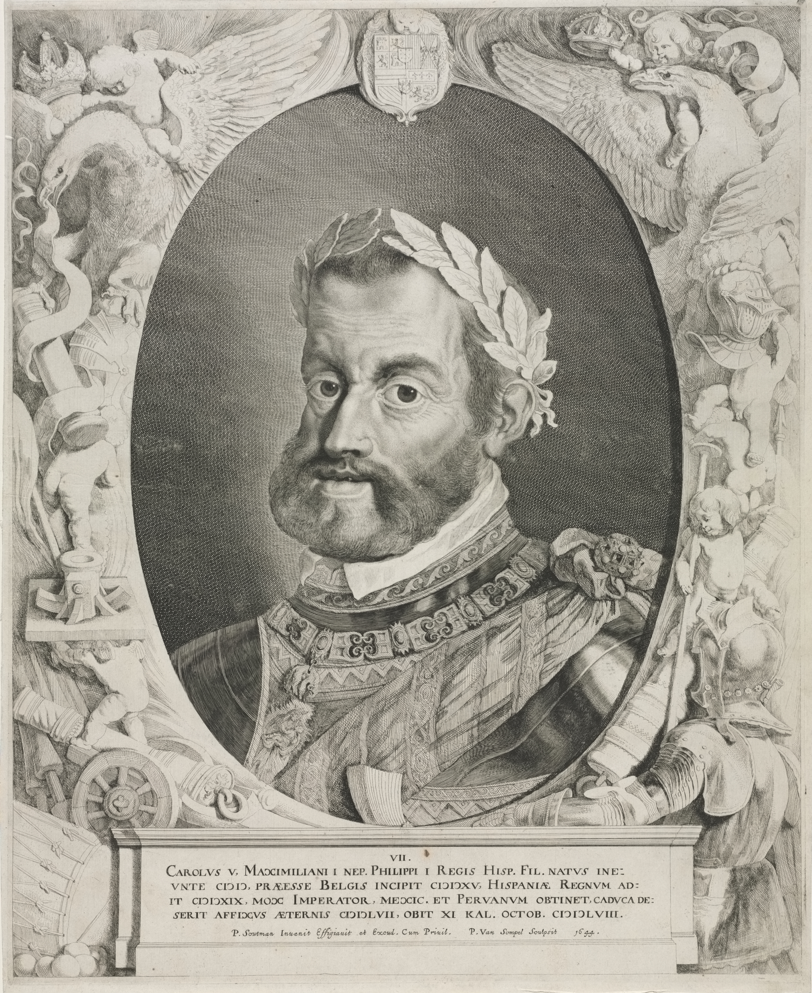 Black and white portrait of a man in ornate clothing. The man has short hair with a few strands curled on the side. He has a thick mustache and beard. He wears a high collar and a decorative shirt. A laurel wreath sits on his head. He is pictured from the chest up inside an oval. The oval is surrounded by an ornate frame. The frame contains cherubs, angels, and other decorative carvings. A shield sits at the top center of the frame. A block of text sits below the oval. The background behind the portrait is white.