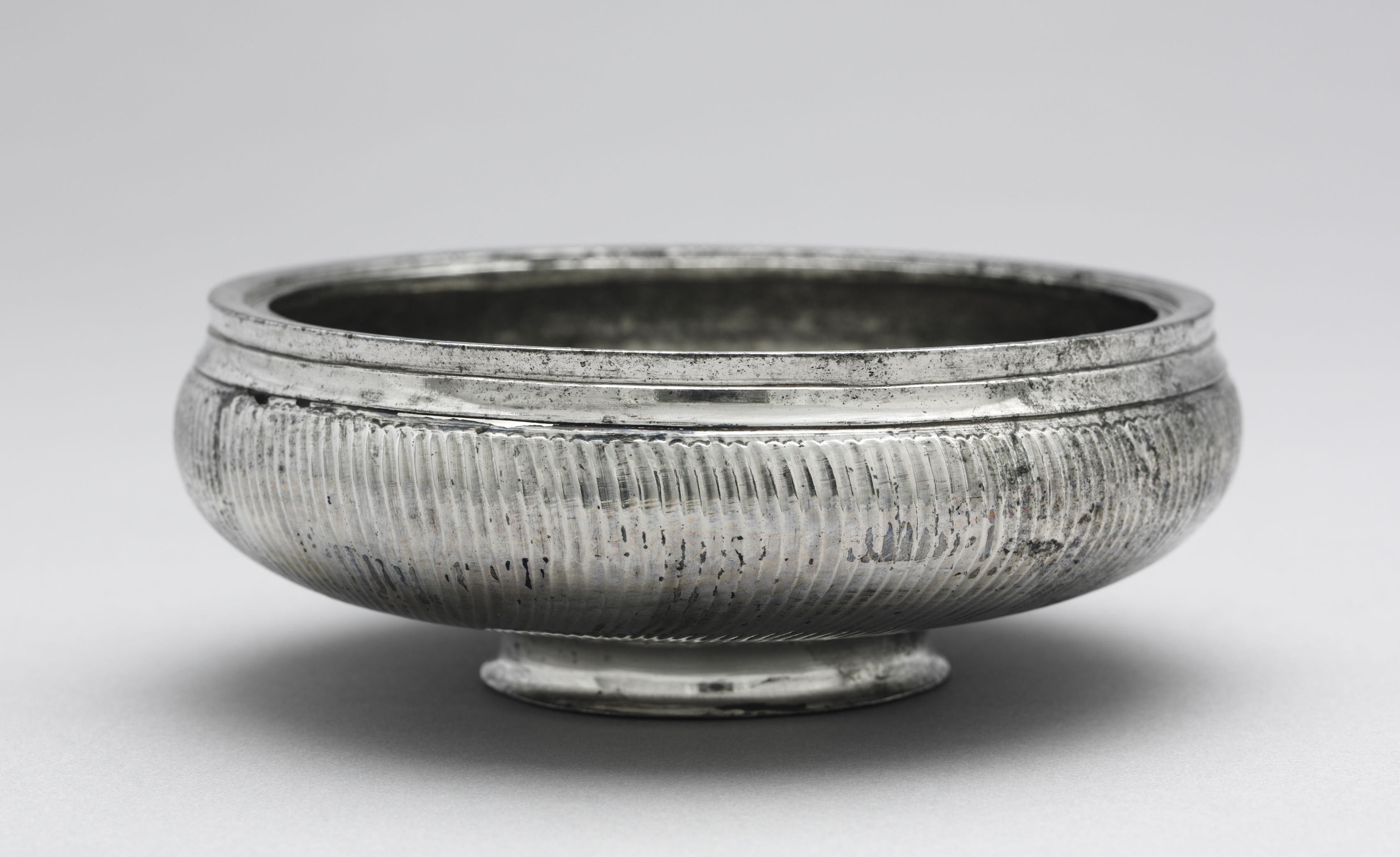 The image shows a bowl by artist Kjell Enger. The bowl is made of a silver or white metal with a dark patina. The bowl is roughly spherical in shape and sits on a short, narrow base. The bowl has a rounded lip and two parallel horizontal grooves encircle the bowl below the lip. The body of the bowl features vertical grooves. The bowl's base is flat and circular. The background of the image is light gray and the bowl casts a shadow on the surface below.