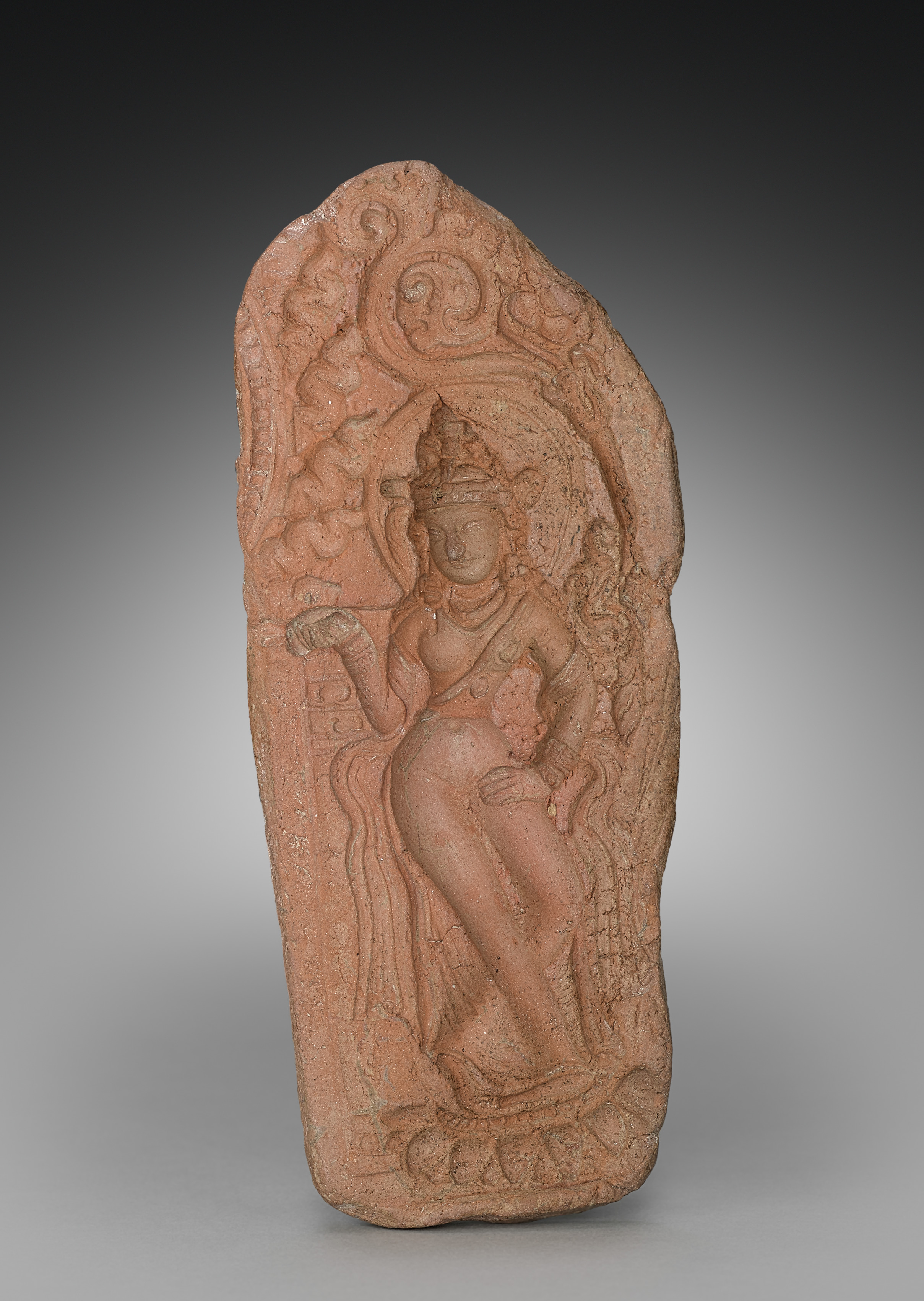 Terracotta sculpture of a female deity, possibly Lakshmi or a similar goddess, standing in a dynamic pose. The figure wears a crown and a flowing dhoti or saree with intricate folds. Her right hand is raised in a gesture, while her left hand holds an object. The sculpture is set against a decorative arch or halo with swirling patterns and motifs. The entire piece has a reddish-brown color with visible texture, suggesting it is made of terracotta. Mould.