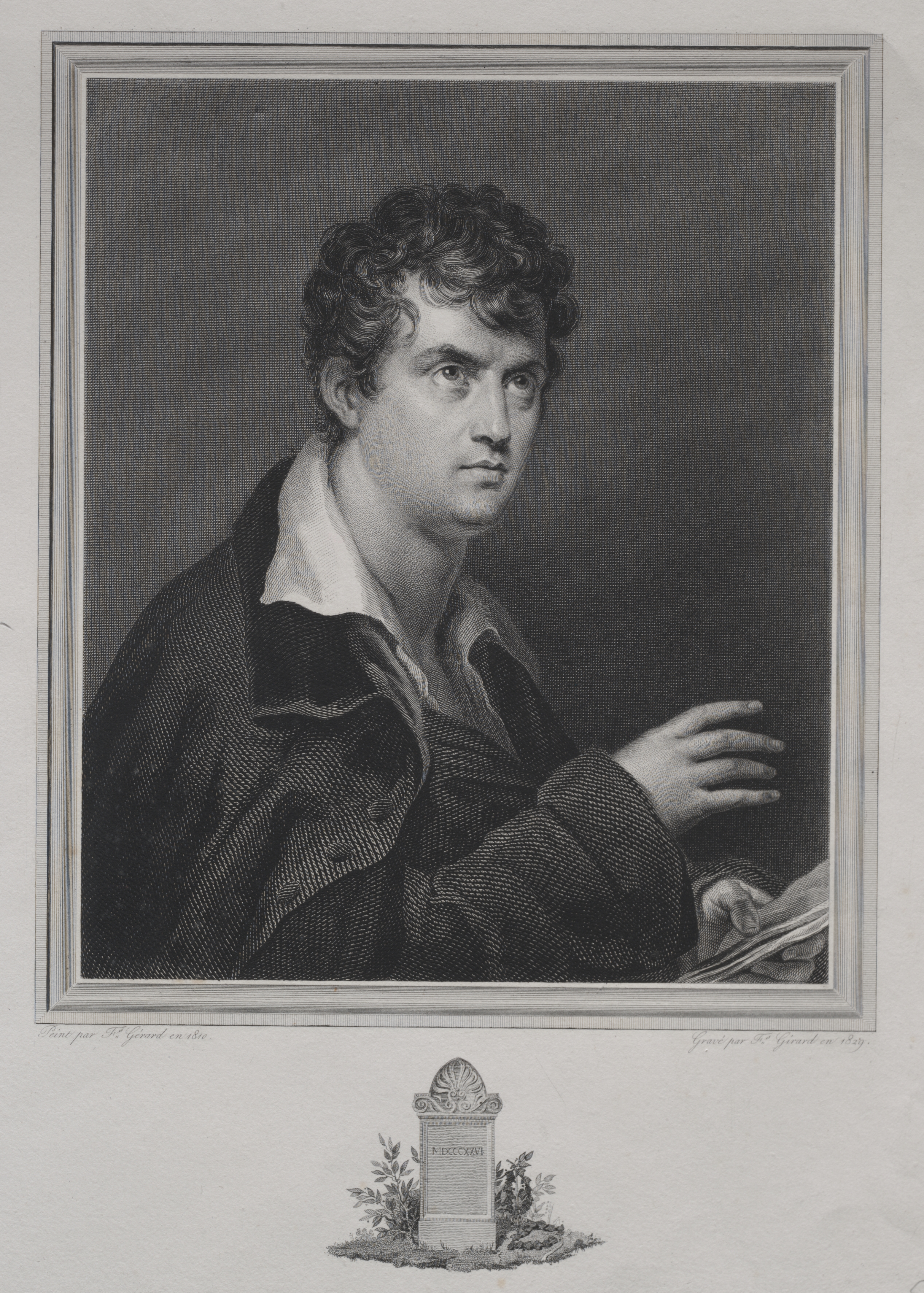 Black and white portrait of a man with curly hair wearing a dark jacket with a white collared shirt underneath. The man is pictured from the chest up, looking to his right with his right arm bent at the elbow and his hand resting on what appears to be a pile of papers. A thin double border surrounds the portrait. Below the portrait is a small drawing of a headstone with some plants growing around it. The headstone features an image of a shell at the top.