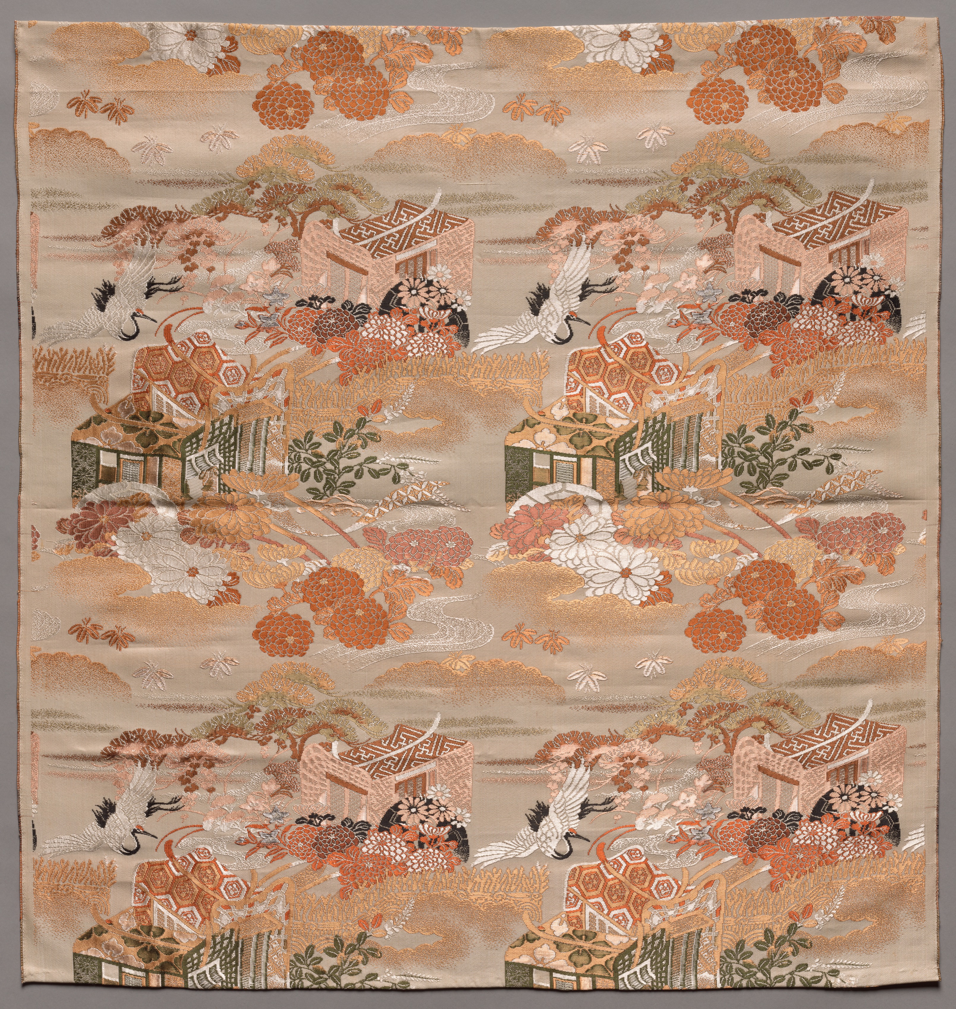 Length of Textile by an unknown artist: A large square piece of fabric featuring a repeating design. The background is beige. The design depicts a scenic landscape with buildings, trees, flowers, and cranes. The buildings have tiled roofs and are surrounded by foliage. Orange and white flowers are scattered throughout, along with green leaves and branches. White cranes with black accents are flying or standing among the scenery. The colors used are primarily shades of orange, white, and green, with some black accents. The fabric appears to be made of silk or a similar material and has a smooth, lustrous finish.