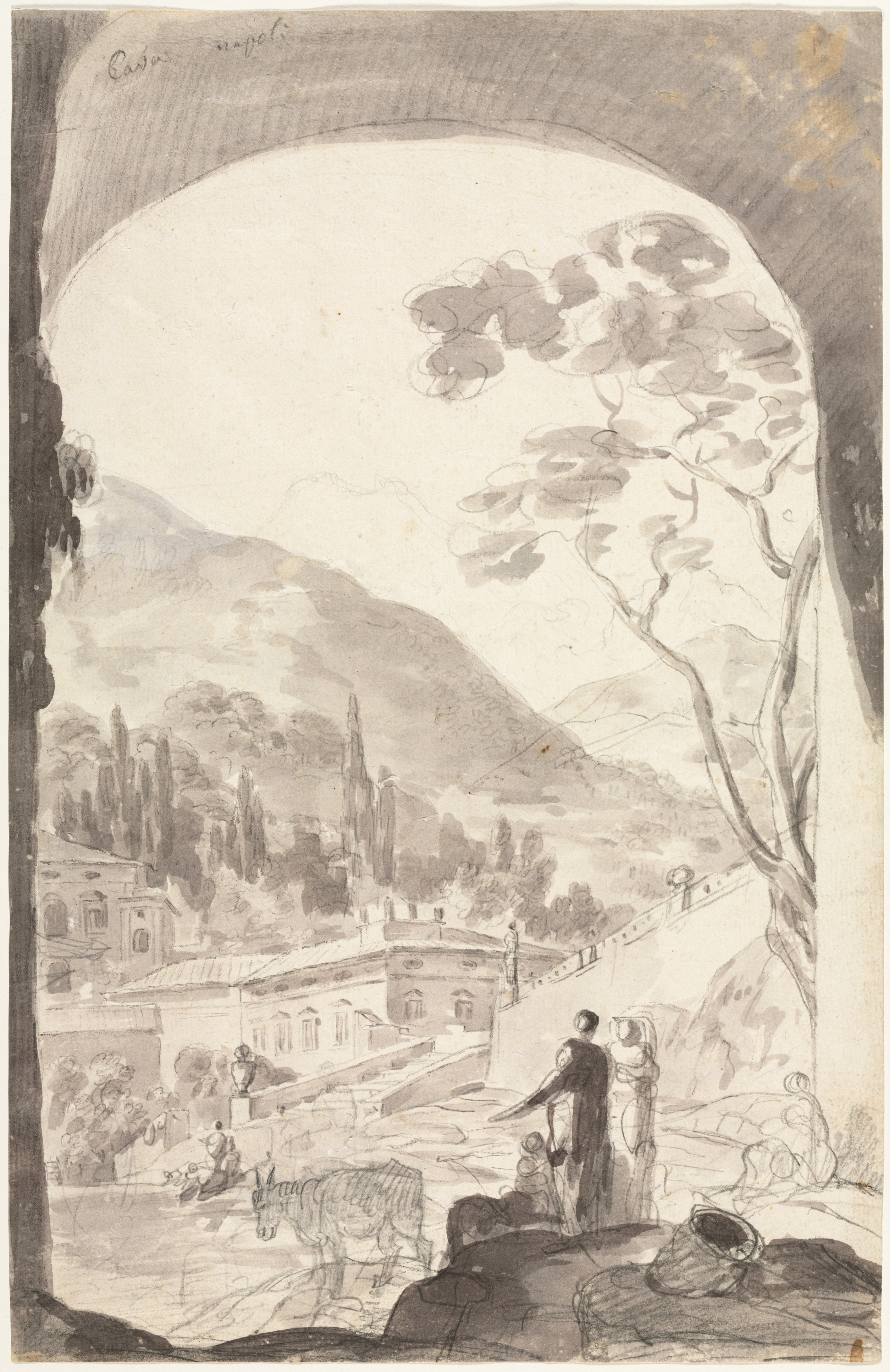 A black and white sketch depicting a landscape scene titled "Cava Napoli" by Jean-Honoré Fragonard. The scene shows a view from under an archway. In the foreground, a man and a child stand on rocks next to a donkey; a tree to their right. There are buildings and trees in the middle ground. Mountains are in the background under a cloudy sky.