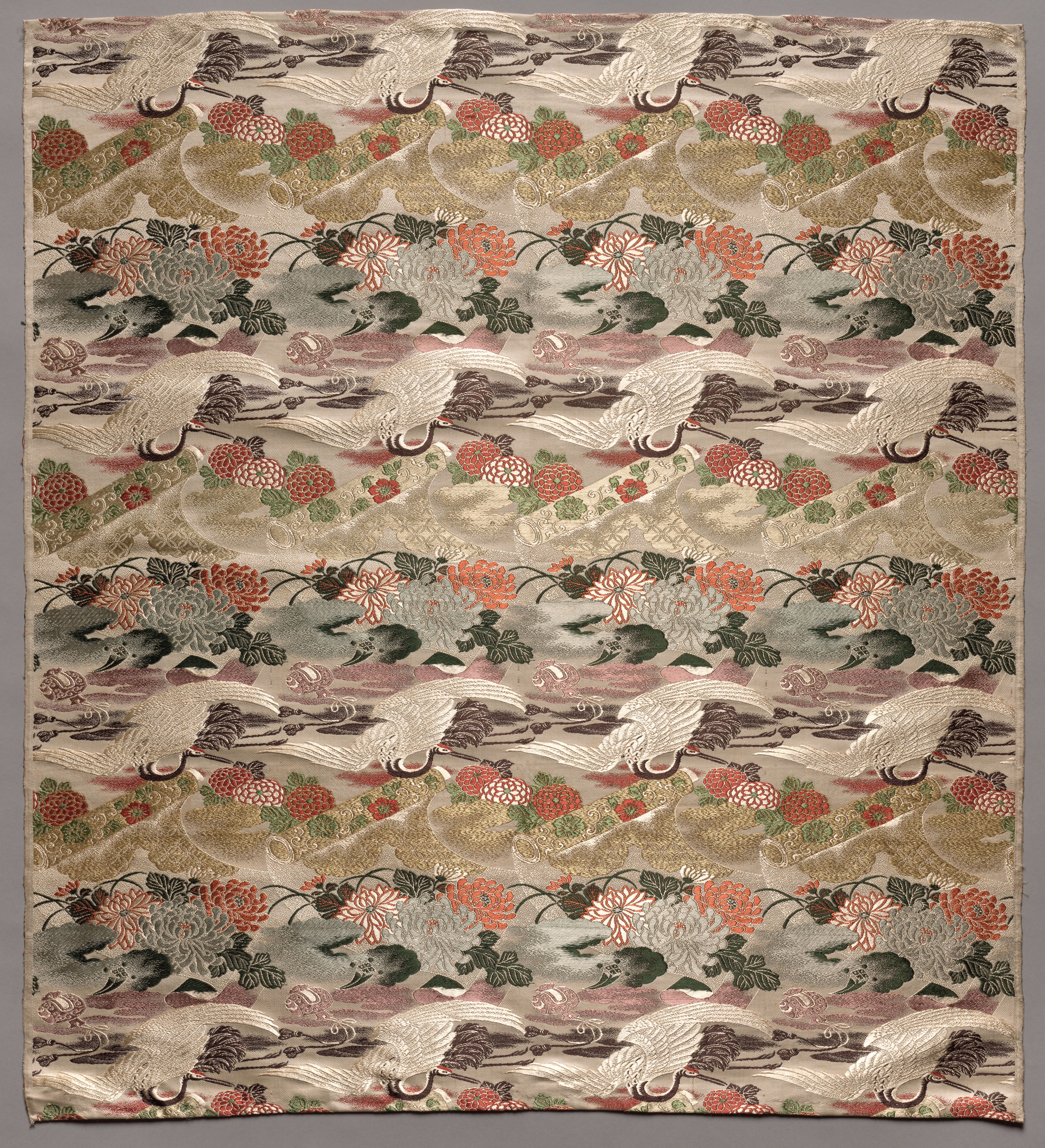 Length of Textile by unknown artist. The image shows a rectangular piece of fabric with a repeating pattern. The fabric is beige with a repeating design of white cranes, flowers, and leaves in shades of red, orange, green, and brown. The cranes are depicted in various poses, with their wings spread and beaks curved. The flowers are peonies and chrysanthemums, and the leaves are green. The pattern is repeated horizontally across the fabric, with each row of cranes and flowers slightly offset from the one above and below it. The fabric appears to be made of silk or another smooth material, and it has a subtle sheen to it. The edges of the fabric are rough and uneven, suggesting that it may have been cut from a larger piece. The background behind the fabric is gray.