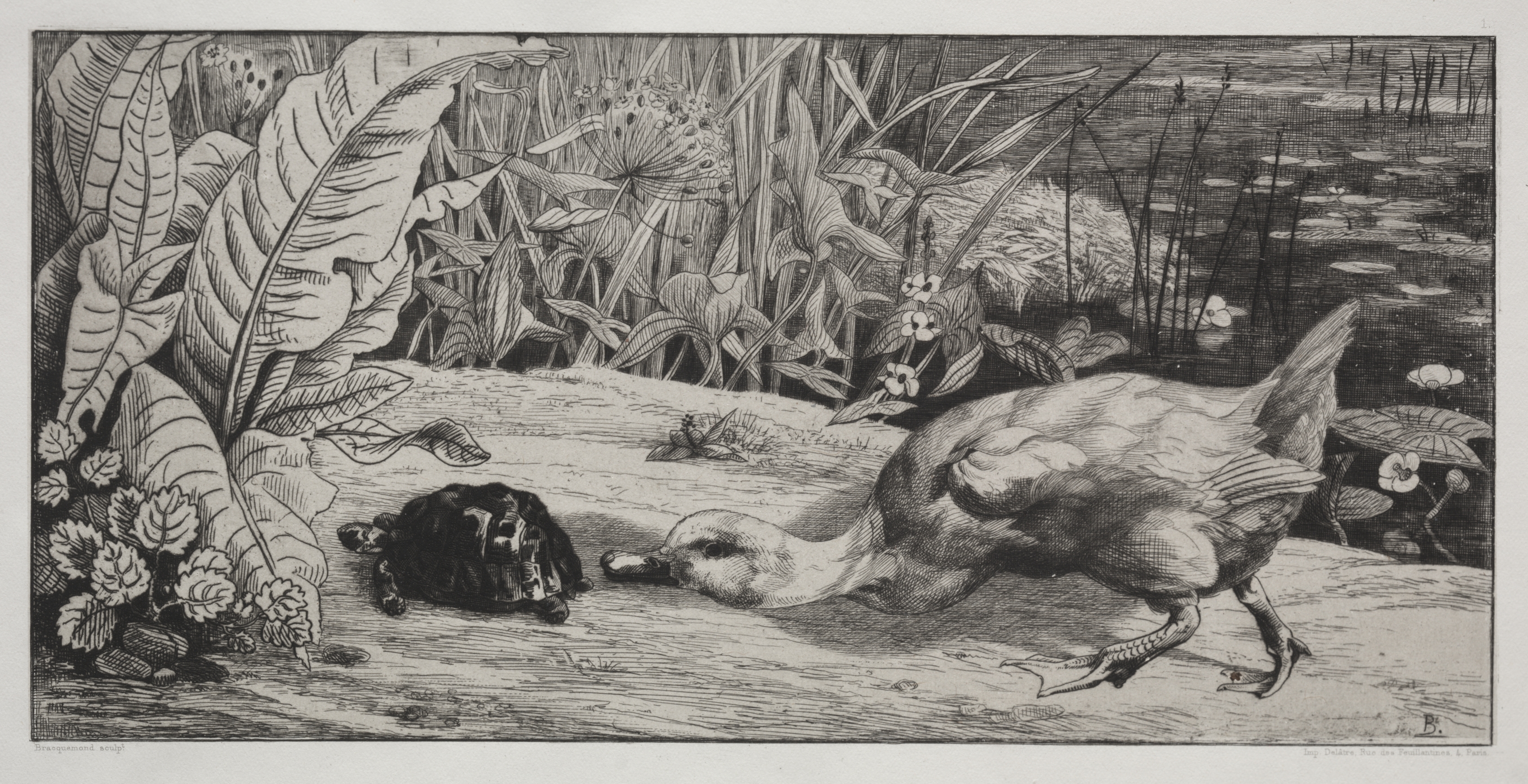 Black and white illustration of a bird bending towards a small furry creature on the ground. The bird has a white head and neck with dark eyes, a light-brown body with darker feathers on its back, and two visible legs with long claws. The small creature has a rounded body covered in dark fur. The pair are on a raised patch of ground surrounded by dense vegetation including large leaves and flowers. There are lily pads with flowers in the background to the right. The entire scene is framed by a thin white border. The work is titled "An Unknown" by Félix Bracquemond.