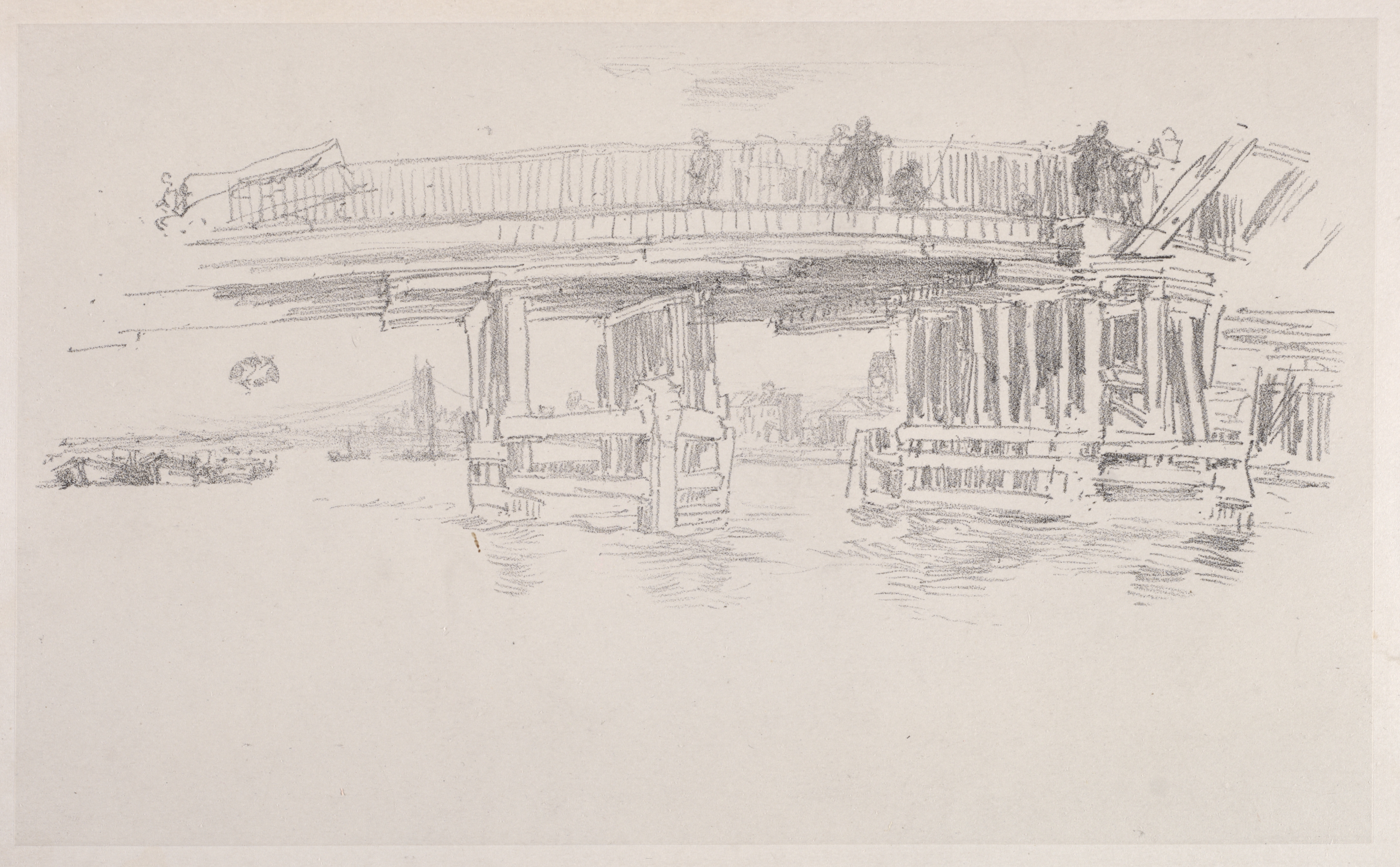 Old Battersea Bridge by James McNeill Whistler. A black and white sketch of a bridge over water. The bridge has a flat top with a railing around it and is supported by several thick columns. Two people are standing on the bridge. The bridge extends from the right side of the image to the upper left. The water below is rippled. There are buildings along the left side. The sky is light gray.
