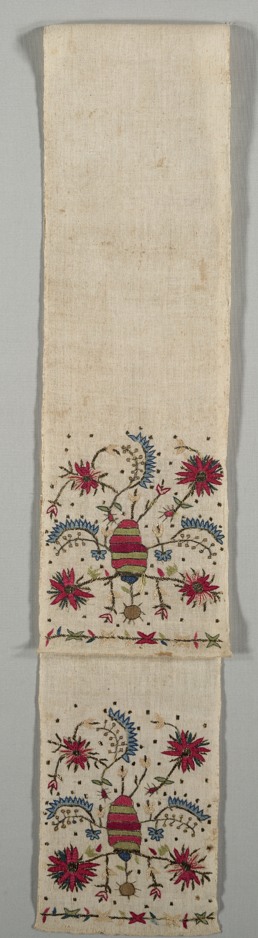 The Embroidered Sash ("Uckur") by unknown artist shows a long, narrow piece of off-white fabric. The fabric is divided into two sections with the top section being plain and the bottom section featuring intricate embroidery. The embroidered section contains a repeating design of stylized flowers and leaves in red, blue, green, and brown. The flowers have multiple petals and are connected by curved stems with leaves. There are small dots scattered throughout the design. Two large, teardrop-shaped motifs with horizontal stripes are present, one on the left side and one on the right side of the embroidered section. The fabric has a rough texture and appears to be made of a natural fiber such as cotton or linen. The background of the image is a plain gray color.