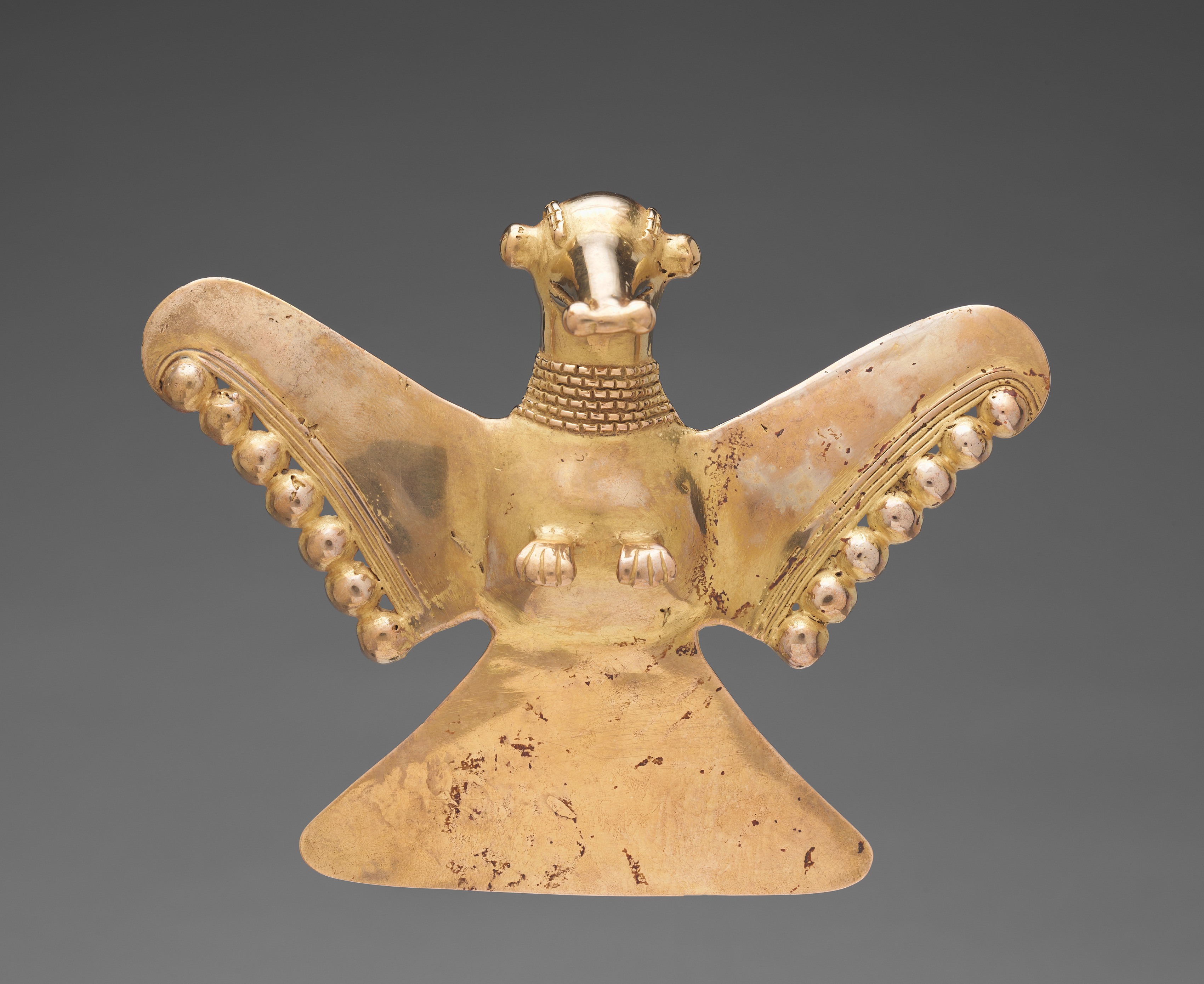 Gold-colored bird pendant with outstretched wings and a crown-like structure on its head. The pendant has a wide base that tapers to a point at the bottom. The wings are wide and have a row of small gold balls along the edges. The body of the bird has a textured neck area. The background is dark gray. The artist is unknown but the piece titled "Bird Pendant".