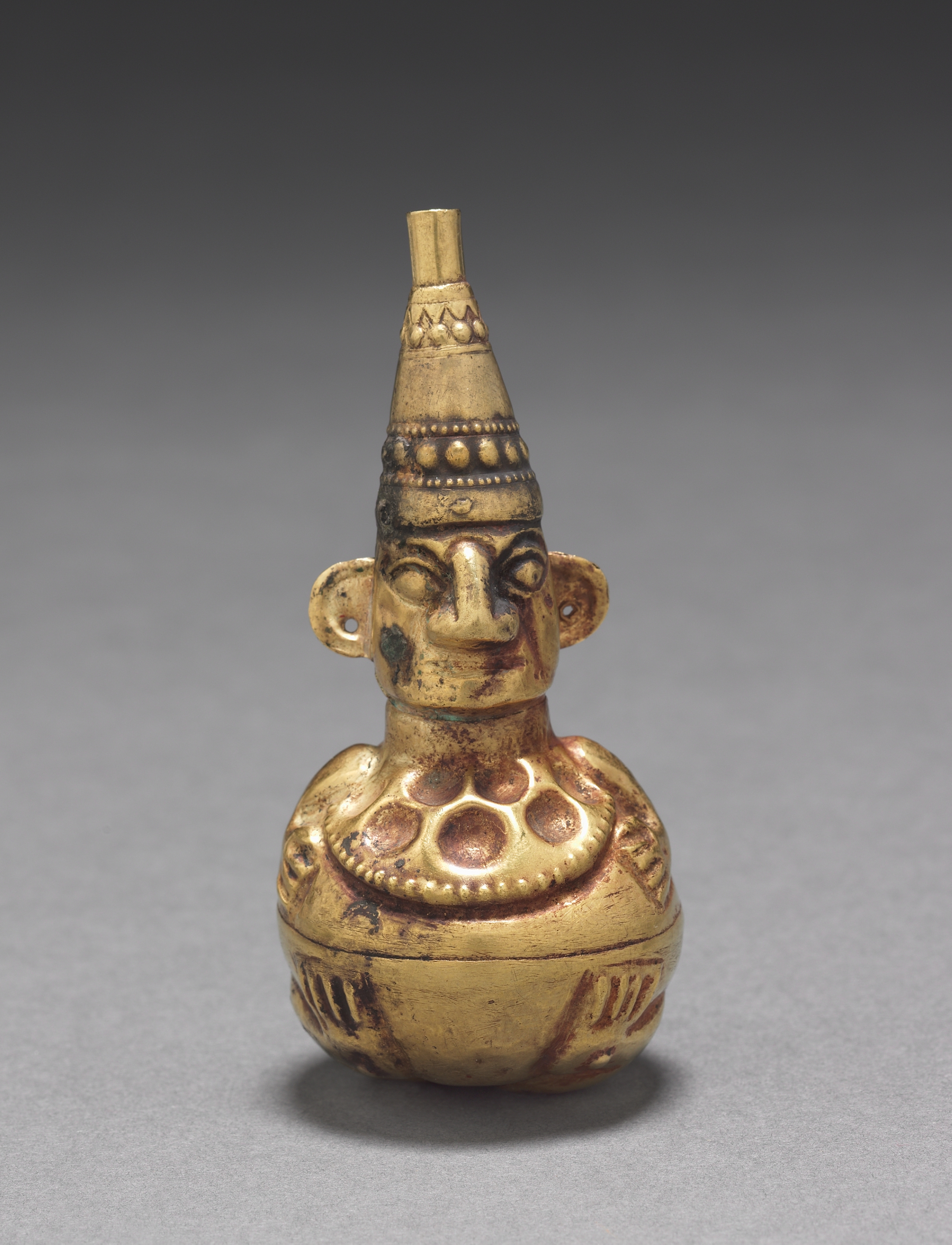 The Figural Flask by unknown artist depicts a gold flask shaped like a human figure. The figure has a large, rounded body and a small head with a long, conical hat on top. The figure has a large nose, small eyes, and large ears. The figure has a large collar around its neck. The flask has a small opening at the top of the hat. The background is gray.