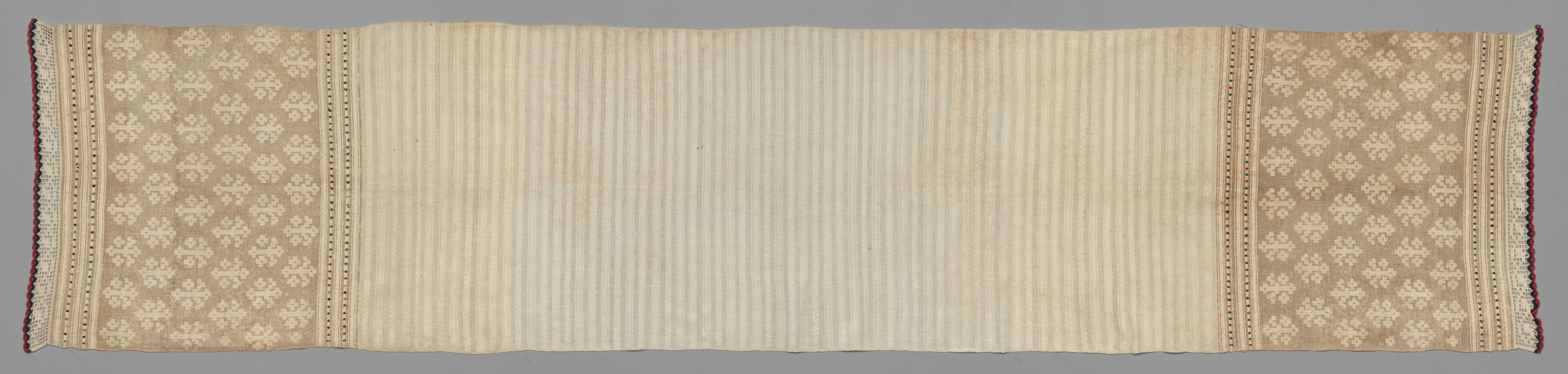 Rectangular towel with a light beige color. The towel features a central section with thin, evenly spaced, darker beige stripes. The left and right sides have a patterned section with a repeating design of small, symmetrical, four-petaled motifs in a lighter beige color. A thin border with small, rounded shapes separates the patterned sections from the central striped area. The towel has a wavy edge and a red and black trim along the short edges. Artist: Towel.
