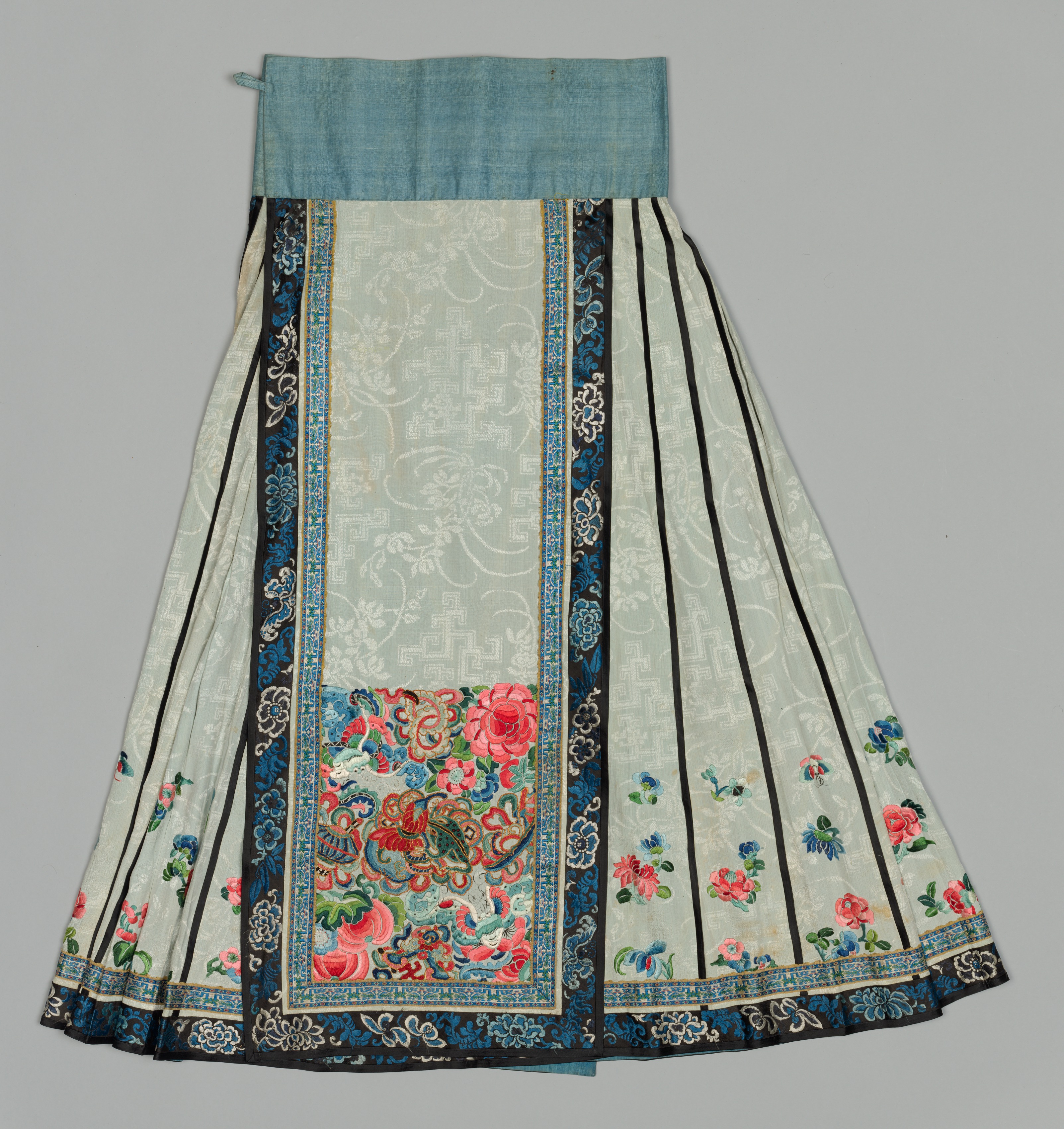 The skirt, by an unknown artist, is a knee-length garment with a light blue waistband at the top. The waistband has a small loop on the left side and is made of a solid-colored fabric. The skirt itself is made up of various sections of fabric, with the main body being white with a light gray floral pattern and featuring 7 vertical black stripes on the right side and 2 on the left. A wide section down the center features a large floral panel at the bottom with pink roses and blue, teal, and gold accents. A thin blue and gold patterned border runs along both sides of the wide center panel. There are 2 narrower panels on either side of the center panel with darker blue, white and gold floral patterns. The bottom hem of the skirt features a border with blue and white flowers on a black background. The skirt also features scattered floral patterns throughout, with pink roses and blue and pink flowers with green leaves. The background of the image is gray.
