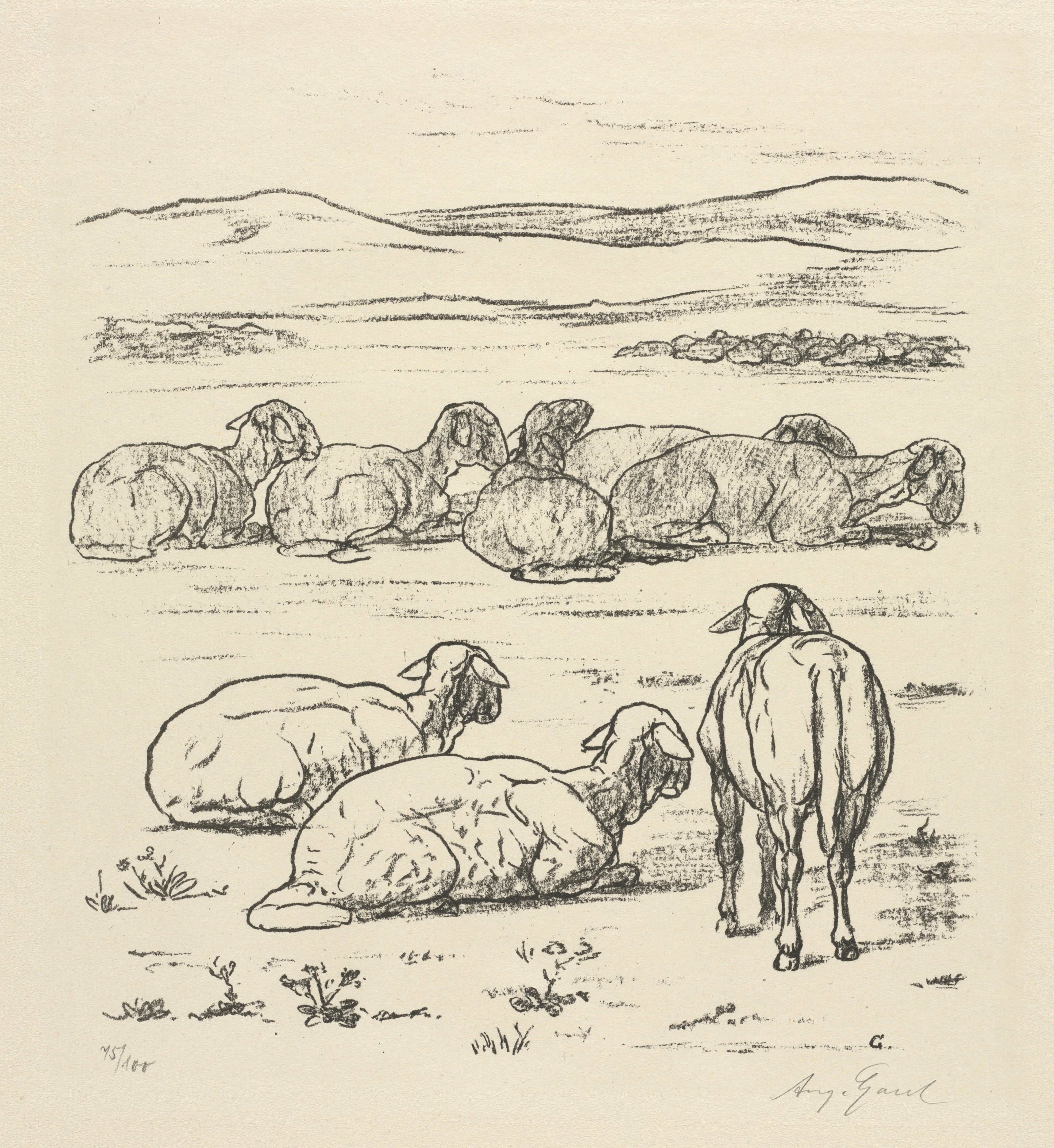 The image depicts a black and white drawing of sheep in a landscape. The scene is divided into two sections. The top section shows a line of seven sheep lying down in a field, facing left. The bottom section shows two sheep lying down, facing away from the viewer and to the right, and one standing sheep facing away from the viewer. The standing sheep is to the right. In the background, there are rolling hills and a cloudy sky. The drawing is signed "Aug. Gaul" in the bottom-right corner. The image is on a beige background.