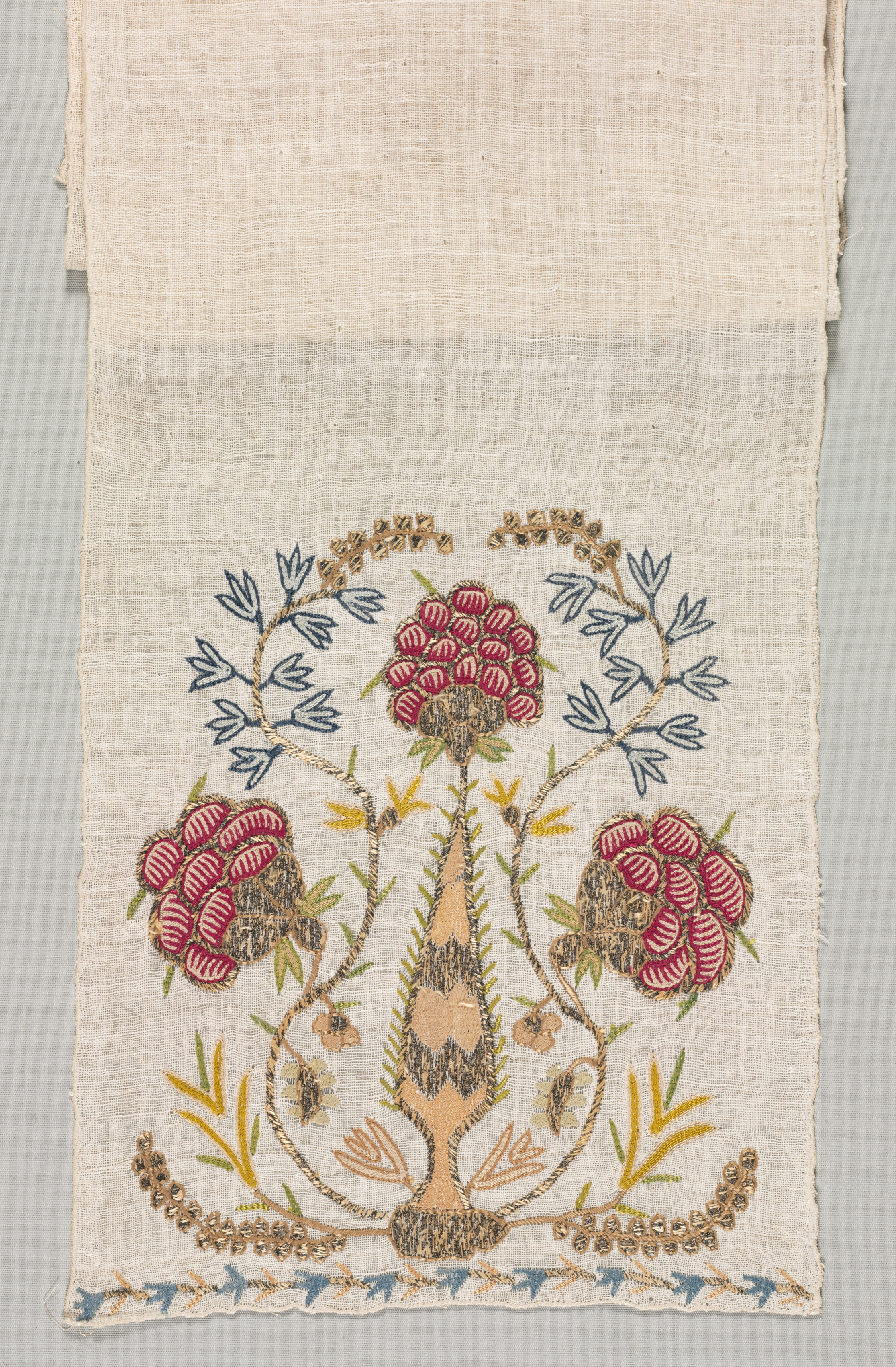 The Embroidered Sash (Uckur) by unknown artist. The image shows a piece of off-white fabric with a floral design embroidered on it. The fabric is rectangular and appears to be made of linen or a similar natural fiber. The top portion of the fabric is plain and has rough, uneven edges. The bottom portion features a colorful embroidered design, which includes a central stem with three large red flowers and several green leaves. The flowers have red and white stripes, and the leaves are various shades of green. There are also blue leaves and stems, as well as some yellow accents. A decorative border runs along the bottom edge of the fabric, featuring blue and gold embroidery. The background behind the fabric is a light gray color.
