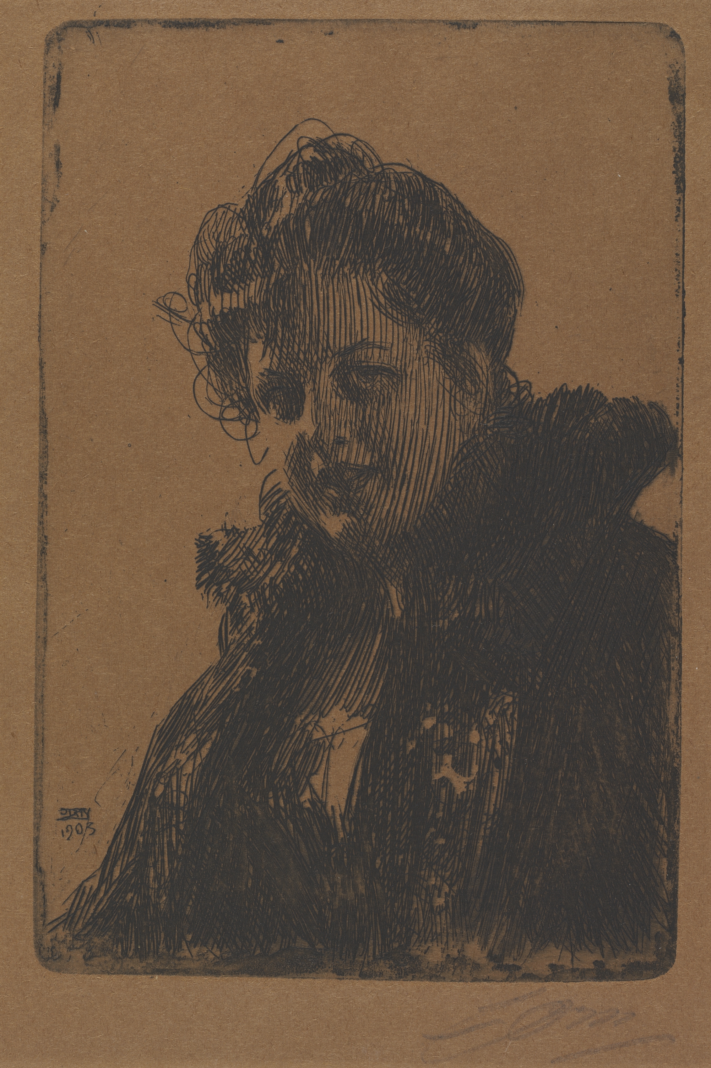 A black and white sketch of a woman's head and shoulders on brown paper. The woman is wearing a hat and a dark coat with a fur collar. Her head is tilted down and to the left. She has curly hair. The background is a solid brown color. The image is signed in the bottom-right corner and has a date in the bottom-left corner. The title of the piece is "Mme. Granberg" and the artist is Anders Zorn.