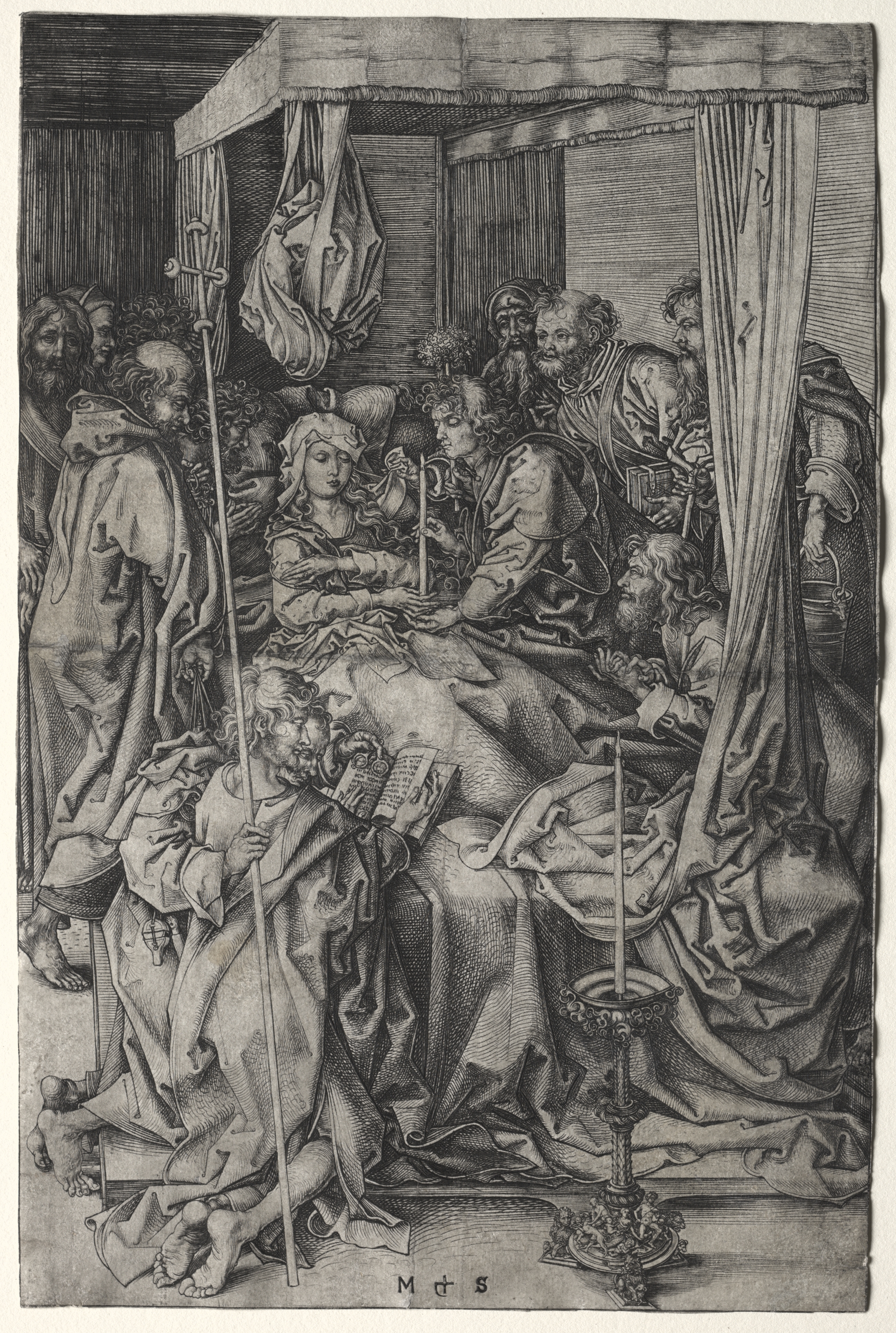 The image depicts a black-and-white drawing of a scene. The scene shows a woman lying on a bed, surrounded by people. The woman is positioned in the center of the image and appears to be deceased. She is wearing a head covering and has her hands folded across her body. There are approximately 13 people around her, some standing and some sitting. A man on the left side of the image holds an open book and a staff. Another man on the right side of the image holds a candelabra. The bed has curtains on either side, and a canopy above. The room appears to have curtains or drapes on the walls. The drawing is detailed and features many lines. The artist's signature, "M + S," is at the bottom center. The overall mood is somber. The image is titled "The Death of the Virgin" and was created by Martin Schongauer.