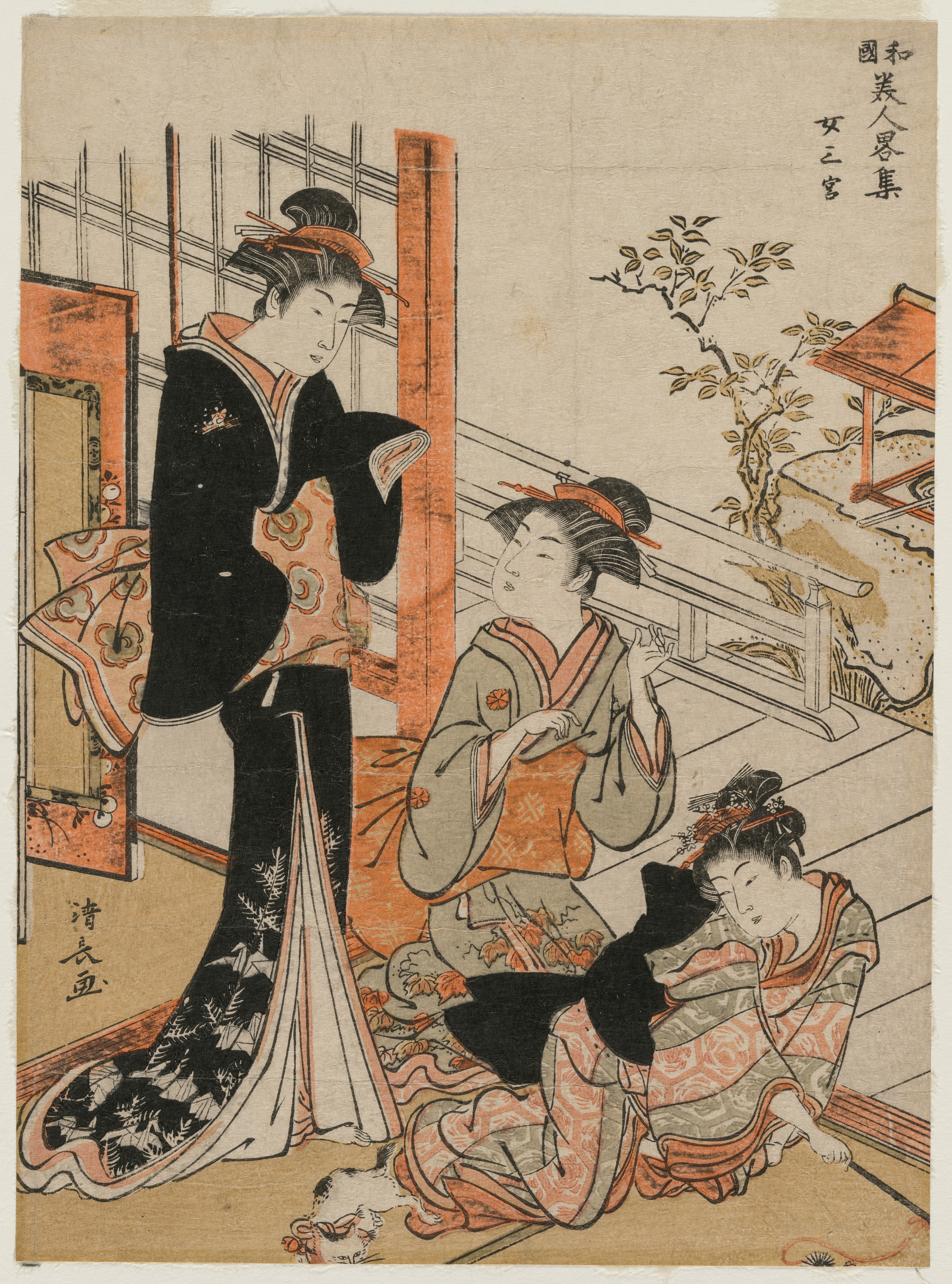 Black-haired woman in a black kimono with white lining and a leaf pattern stands on the left. She faces right with her head bowed, holding a fan in her right hand. A woman in a gray kimono with orange lining and pattern sits on a low platform in the middle, facing left, holding something in her right hand. A woman in a pink kimono with gray lining and pattern sits on the floor on the right. She faces right and holds a black object. The background shows a wooden floor, a window with a lattice pattern, and a plant with sparse leaves. There is Japanese text on the top right and left side.