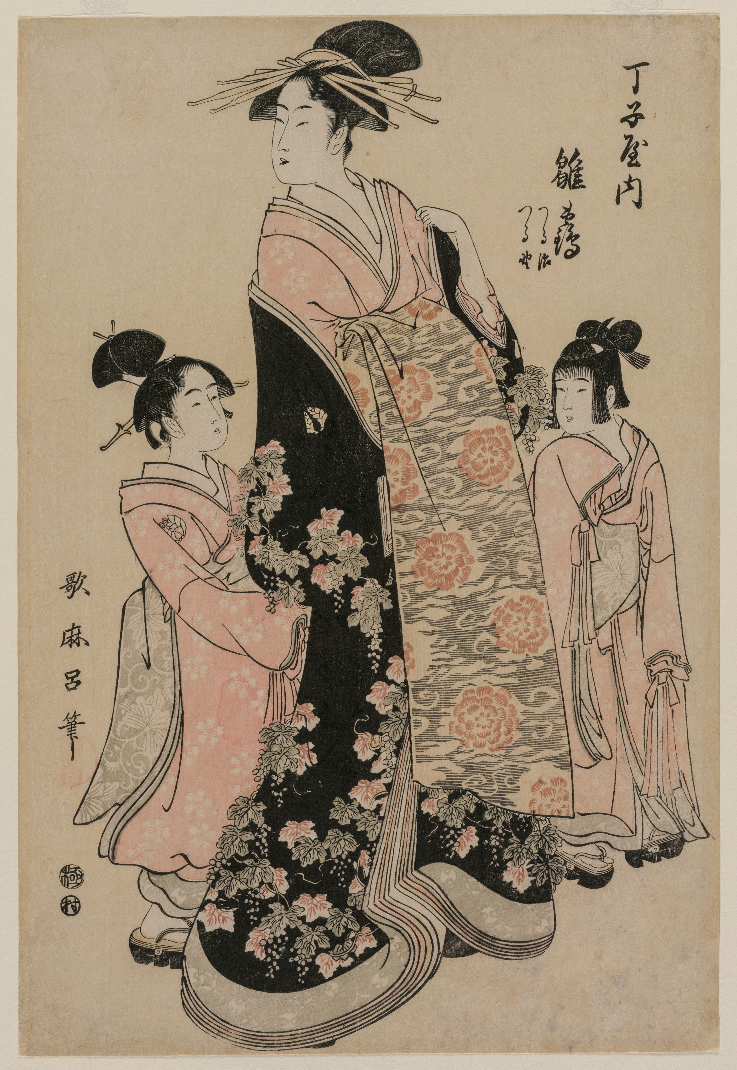The Courtesan Wakakusa of the Chōjiya Brothel, and Attendants Asano and Midori, from the series “A Pattern Book of the Year’s First Designs, Fresh as Spring Herbs” (Hinagata wakana no hatsumoyō)