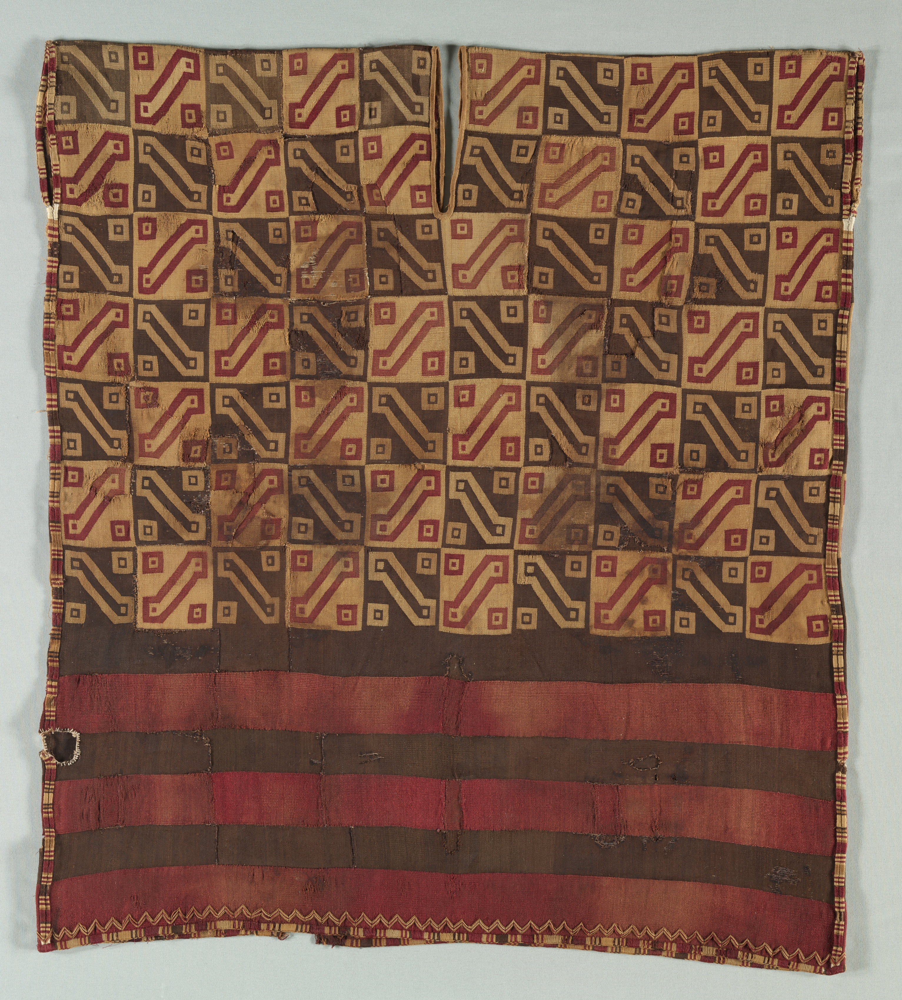 Tunic by unknown artist. The image shows a rectangular piece of fabric with a patterned design. The top section of the fabric features a repeating pattern of squares in shades of brown, beige, and red. Each square contains geometric shapes, including lines and squares. The bottom section of the fabric has horizontal stripes in shades of red and brown. The fabric has a decorative border around the edges, with a zigzag pattern at the bottom. The fabric appears to be made of a rough, woven material and has some visible signs of wear and tear, including fraying and discoloration. The background of the image is a plain light gray color.
