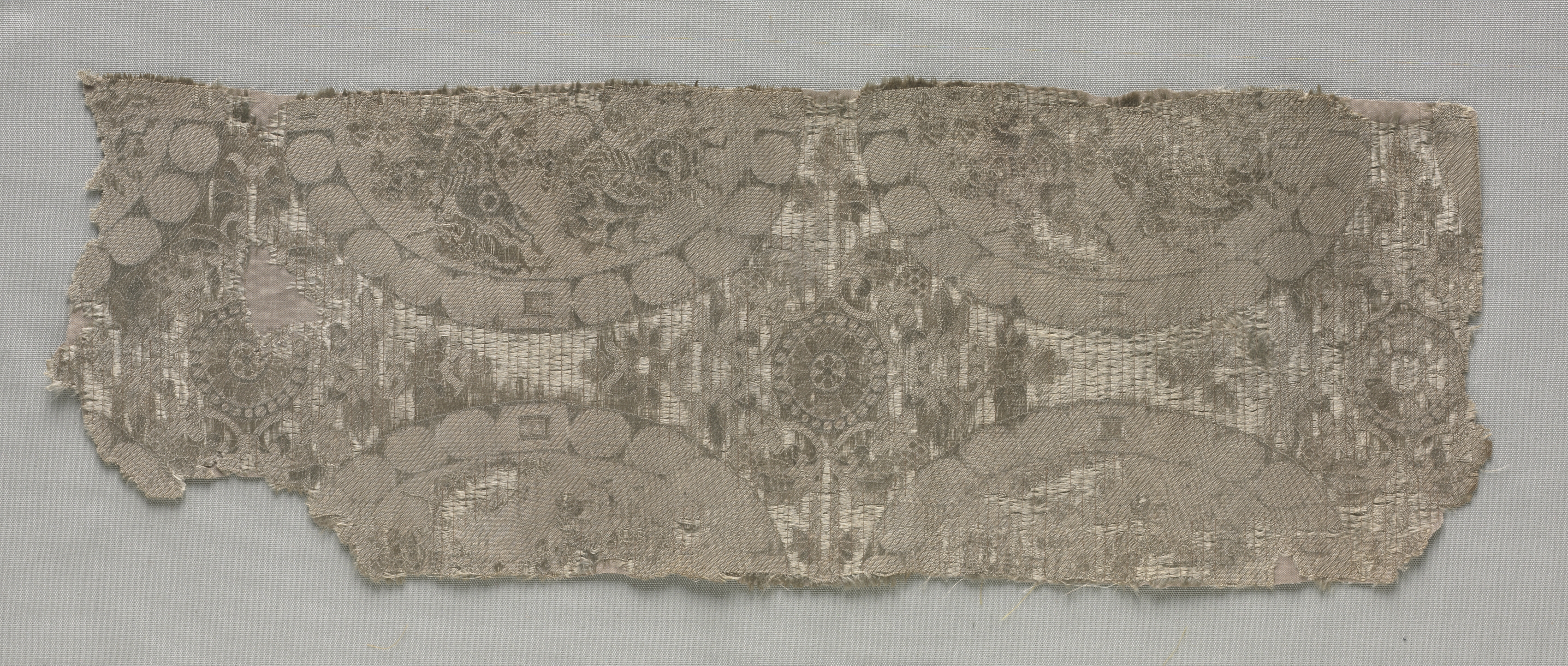 Brown and beige-colored fabric fragment with a frayed edges and floral patterns. The fabric appears to be old and worn, with visible signs of decay and deterioration. The background of the image is a light gray color. The fabric titled "Fragment" by the artist.