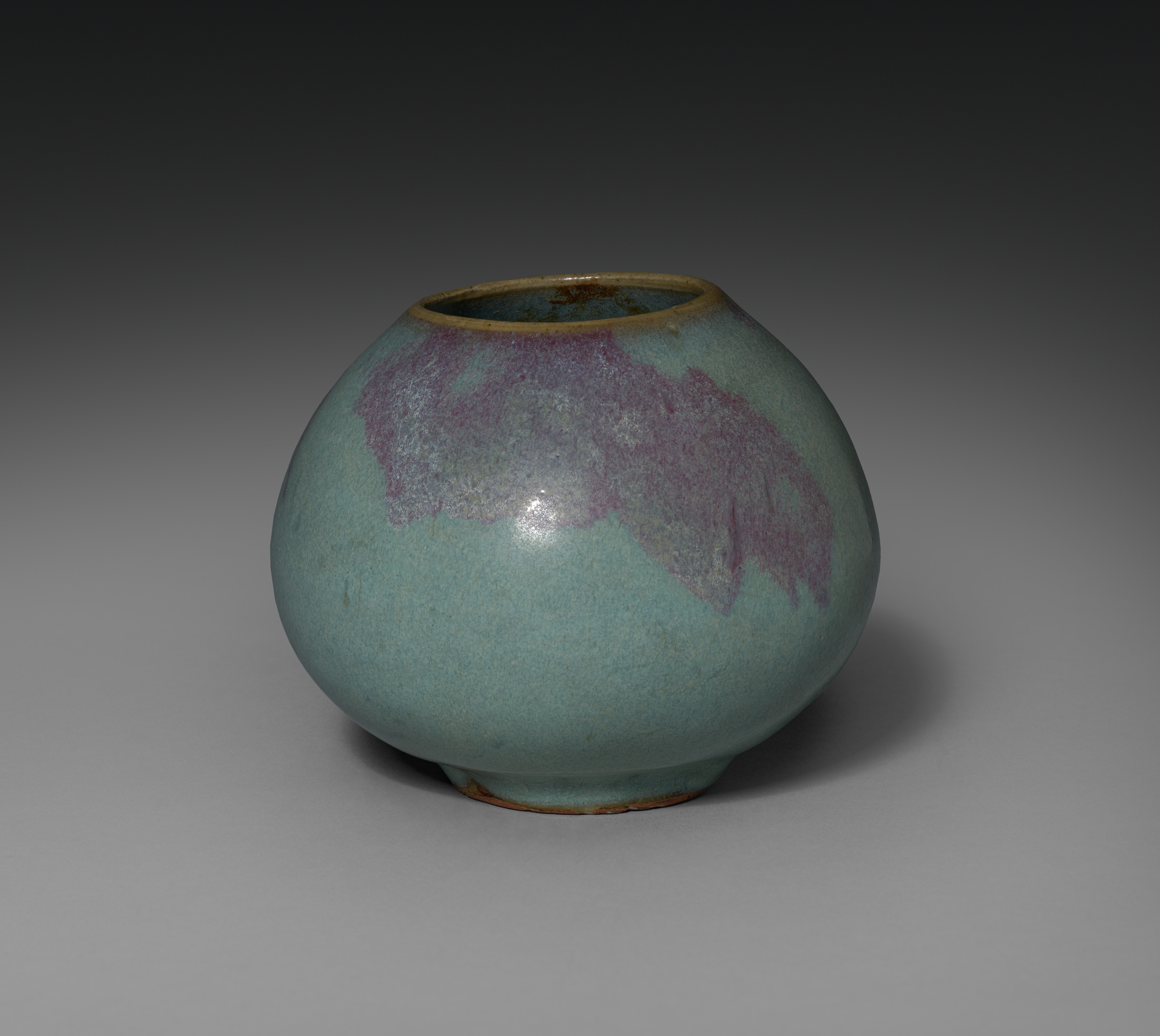 The image depicts a Jar with Cover, created by artist Shofu Bunzaemon. The jar has a rounded body with a wide mouth and a small foot at the base. The jar's base color is teal with purple patches on the upper right side and a brown rim. The jar is placed on a gray surface with a shadow cast to the right. The background transitions from dark gray at the top to light gray at the bottom. The jar appears to be made of ceramic material. The image shows the jar from a slightly angled front view. The jar has no visible handles. The lid is not shown.