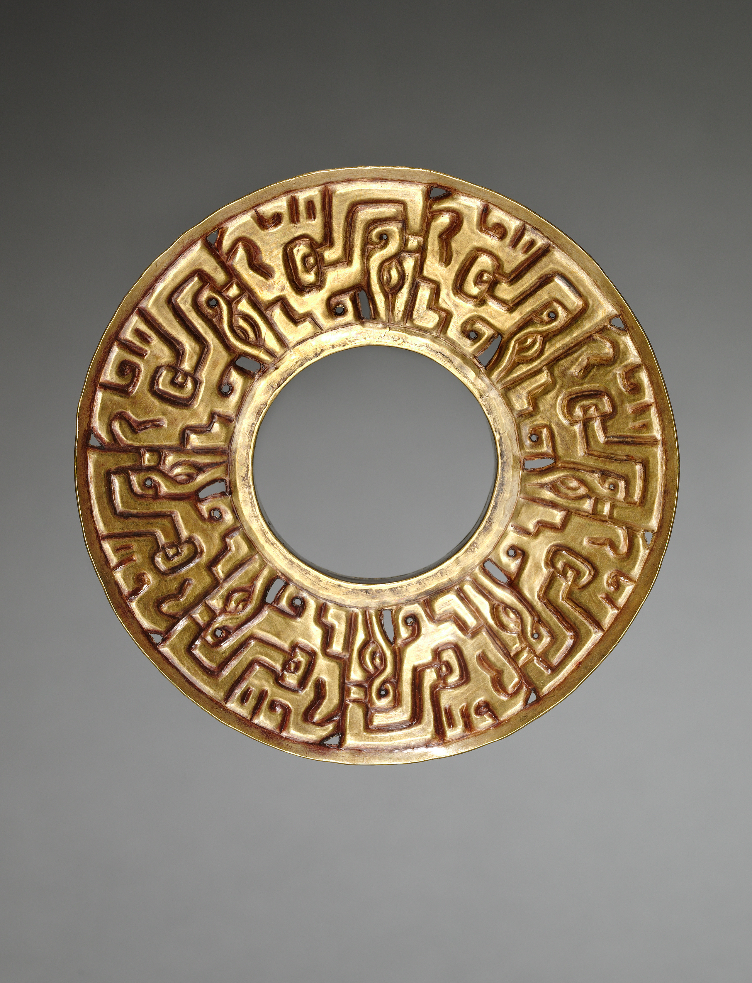 Gold circular ear ornament with a large central hole, featuring intricate designs and patterns etched into its surface. The etched designs are brown. The background is dark gray to light grey gradient. Title: Ear Ornament. Artist: Unknown.