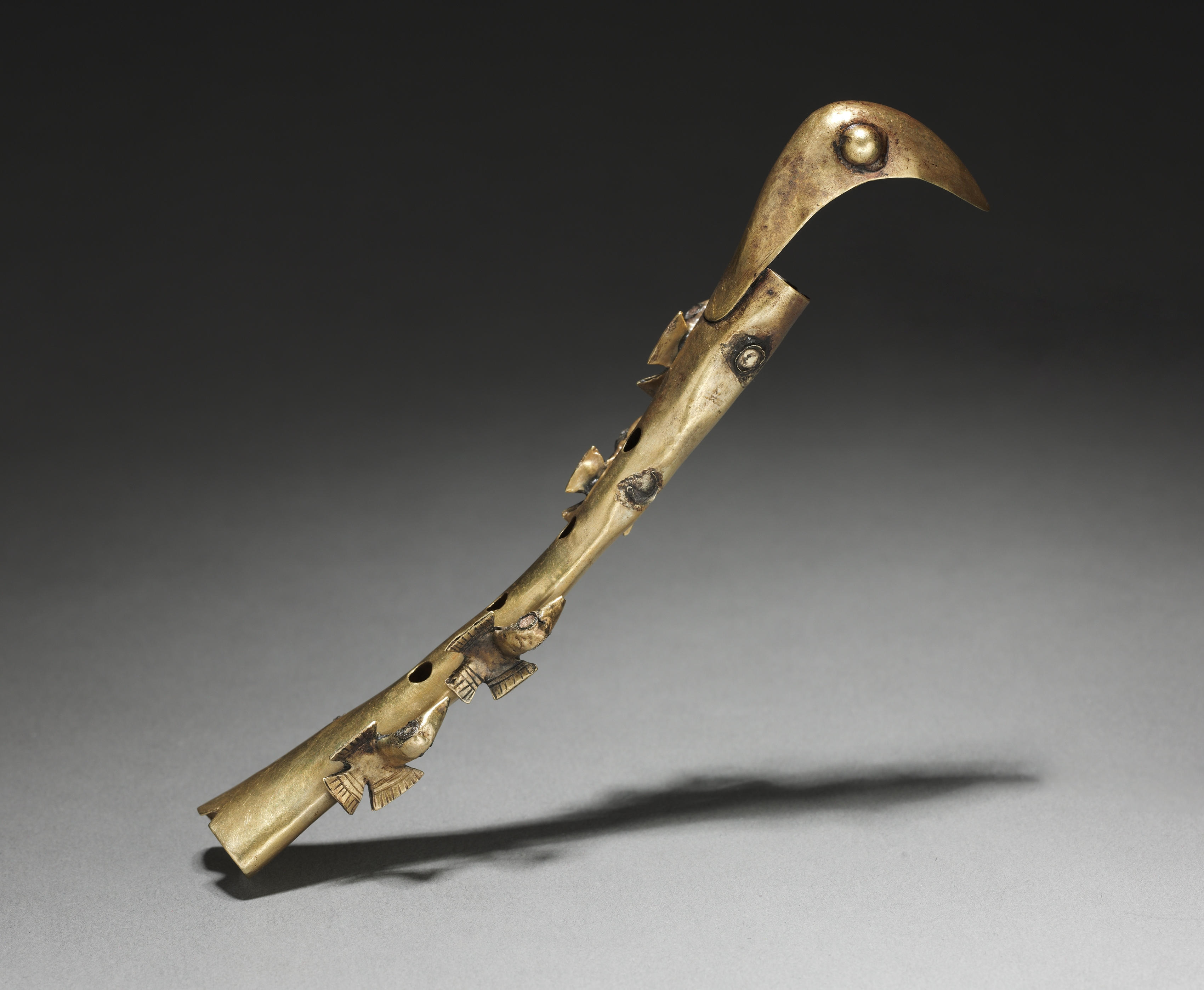 The image shows a brass flute by the artist titled "Flute". The flute is made of brass and has a curved end. The flute is decorated with small human and animal figures. It has a long, thin body with a flared end, and several small holes along its length. The flute is positioned at an angle. The background is dark gray and light gray, with a shadow cast by the flute.
