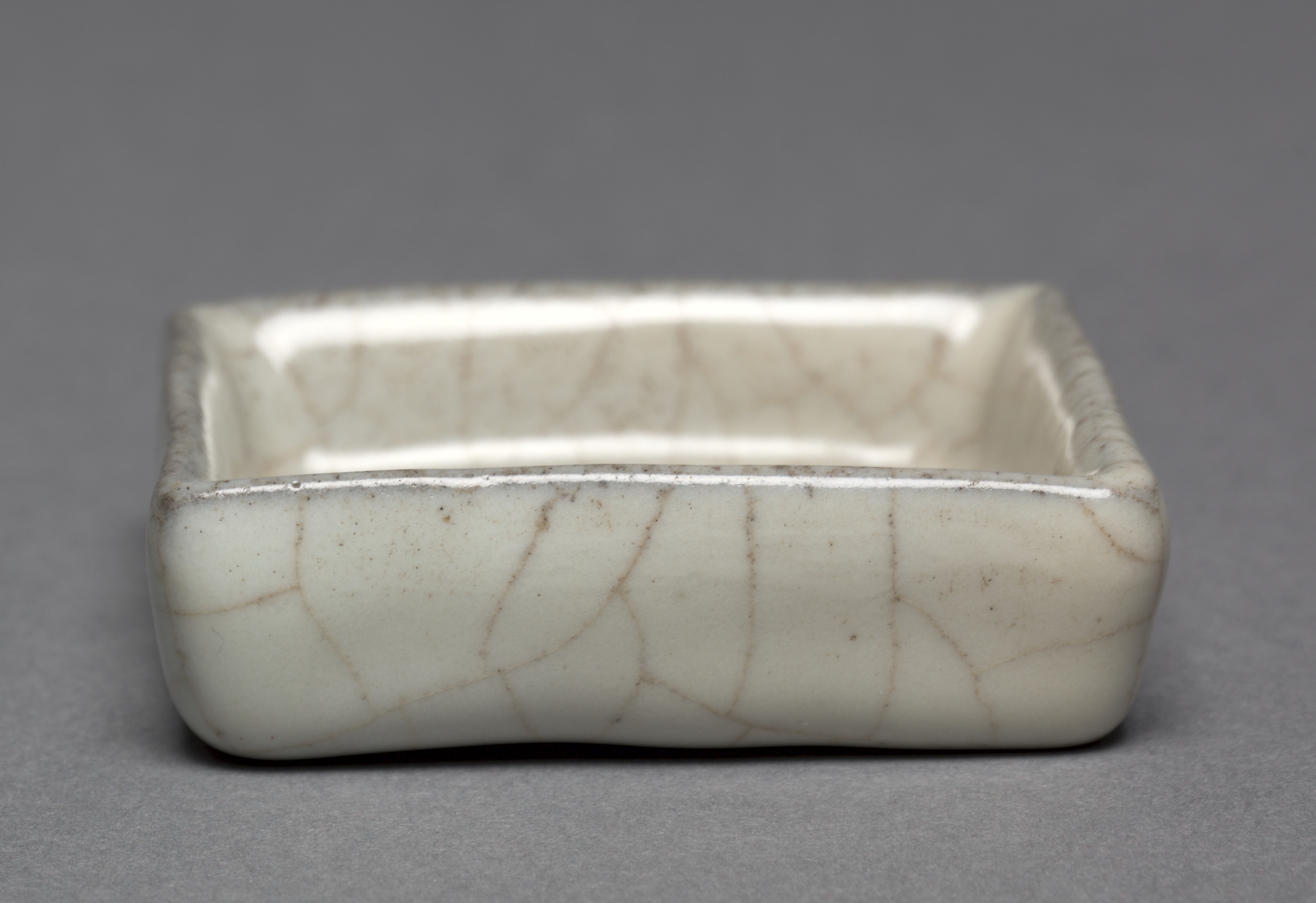 The Guan ware square brush washer has a white glaze with a crackle pattern. The crackle pattern appears as fine, brown lines across the surface. It has a rectangular shape with rounded corners and straight sides. The interior and exterior surfaces are glazed. The base is flat. The piece is low and wide. The background of the image is gray.