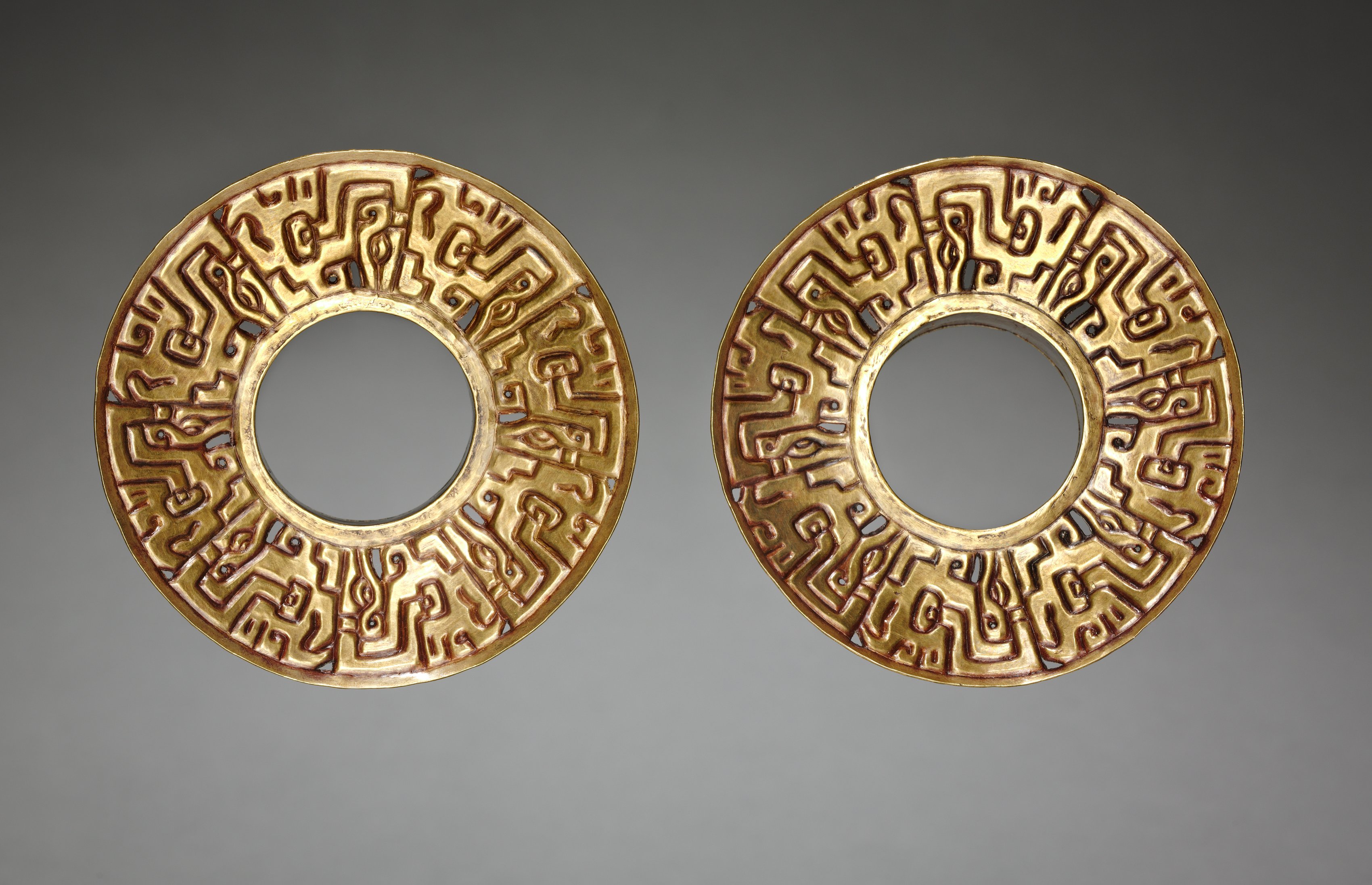 Pair of Ear Ornaments by unknown artist. Two gold-colored, circular objects with intricate designs. The objects are identical and have a hollow center. They are both circular with a raised, maze-like pattern around the edges. The pattern consists of various shapes, including lines, curves, and geometric forms. The background is a gradient of gray, with the top being darker and the bottom being lighter.