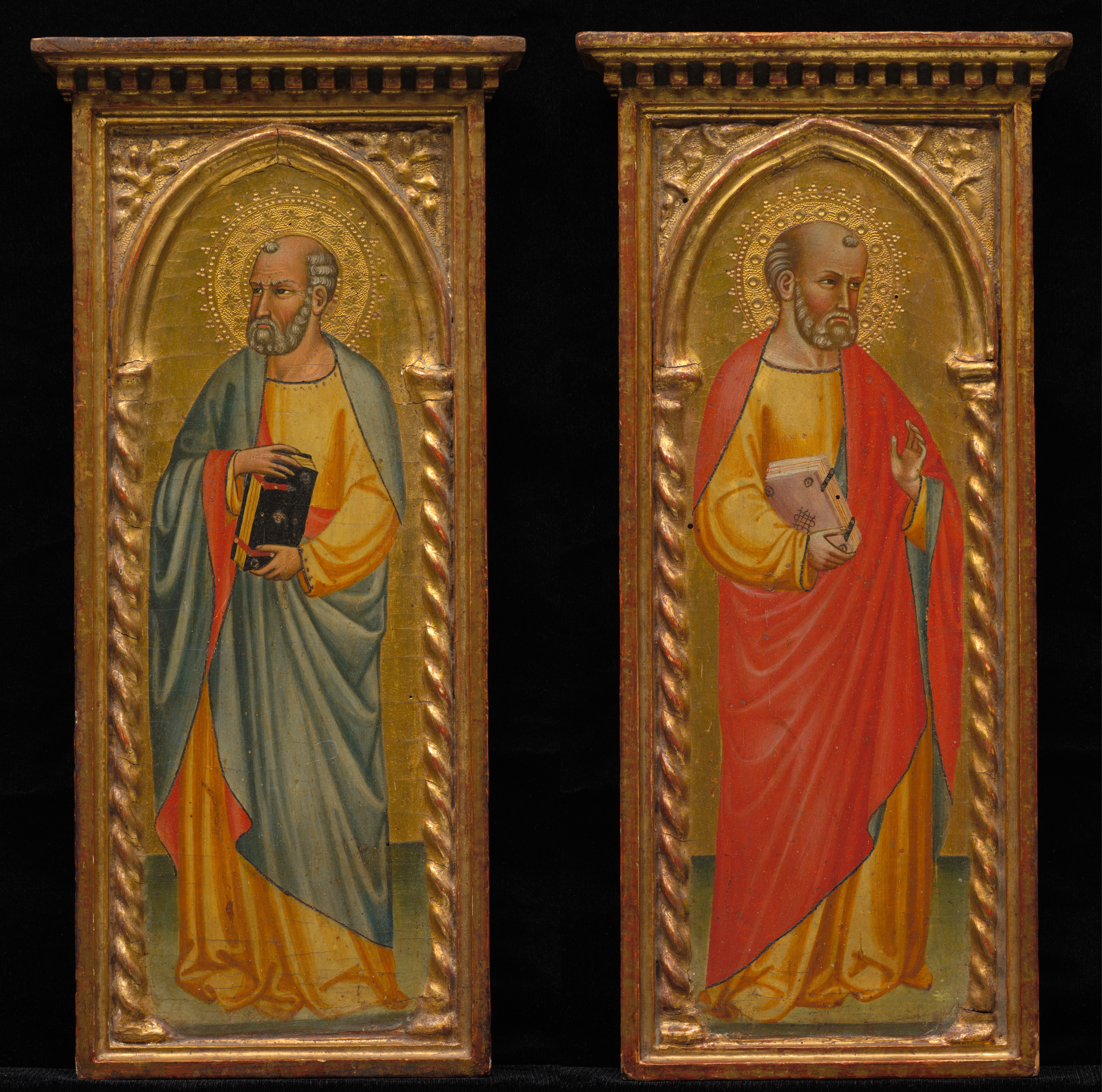 Two vertical, rectangular paintings of saints side by side. The paintings have a gold frame with a decorative border. The left saint has a halo and wears a green robe over a yellow shirt and orange under robe, holding a black book. The right saint has a halo and wears a red robe over a yellow shirt and green under robe, holding a white book and gesturing with right hand. Both saints have gray hair and beards, and stand on a green floor. The background of each painting behind the saint is gold. The background behind the paintings is black. The artist is unknown. The title of the work is "Standing Saint and Saint in Red Cloak."