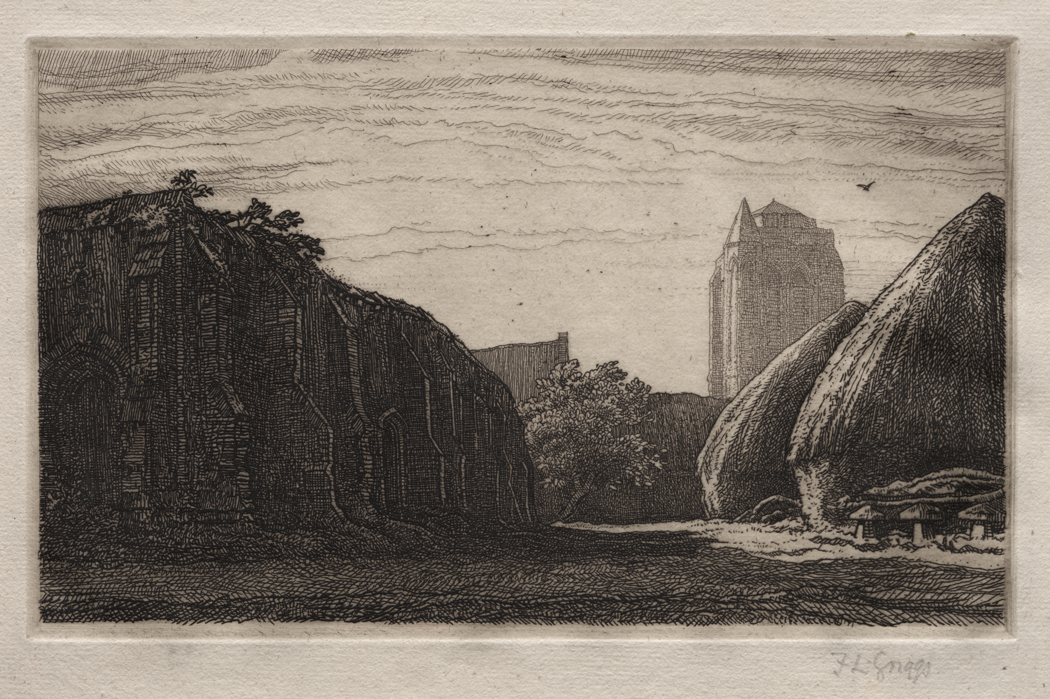 Black and white etching of a landscape with a dirt road, buildings on the left and right, and a large stone tower in the background. The buildings on the right appear round and thatched. A tree sits in the center. The sky is cloudy. The print is on a white background.