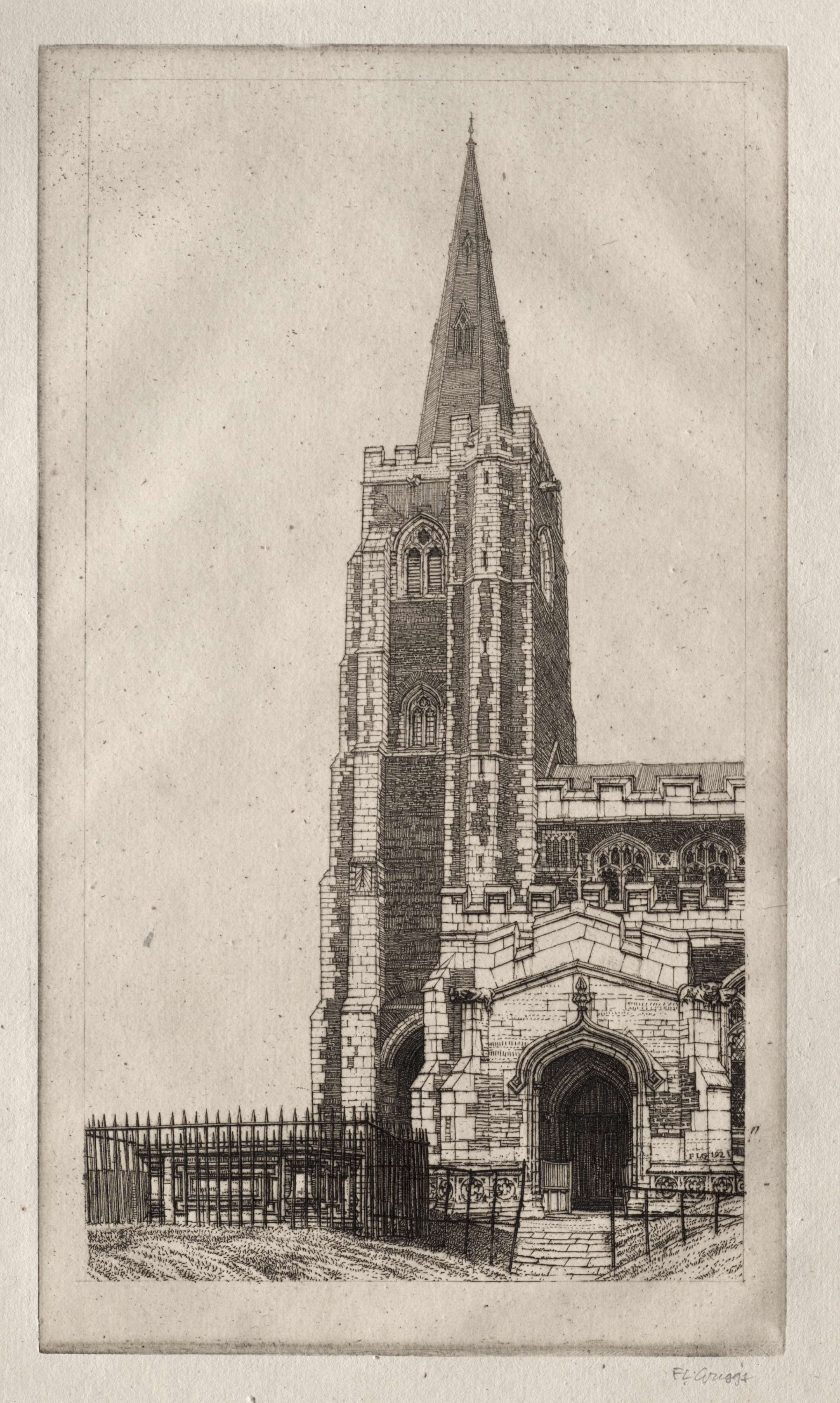 Black and white drawing of a church. The church has a tall tower with a pointed steeple. The tower is made of brick and stone and has several arched windows. The church has a large arched doorway with a stone entrance and a black metal fence. The fence has spikes on top. There are stone steps leading up to the doorway. The sky is light gray. The drawing is on a beige background. The artist's signature is in the bottom-right corner.