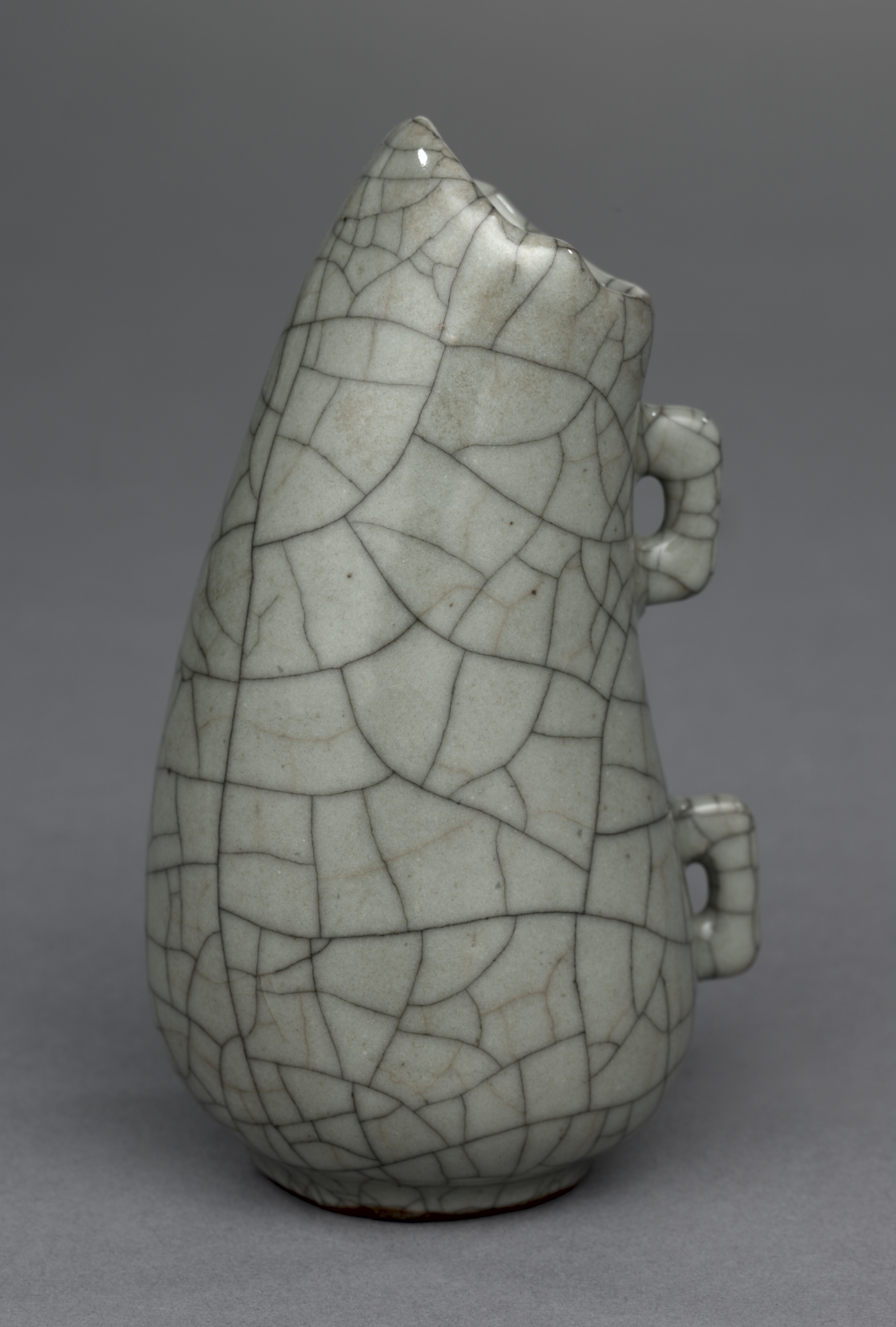 The image depicts a white ceramic water flask with a crackled glaze, resembling a teardrop shape. The flask's body is covered in a crackled pattern. It has a handle on the right side, and its base appears to be flat with a brownish rim. The background is gray, and the object is titled 'Water Flask: Guan ware'.