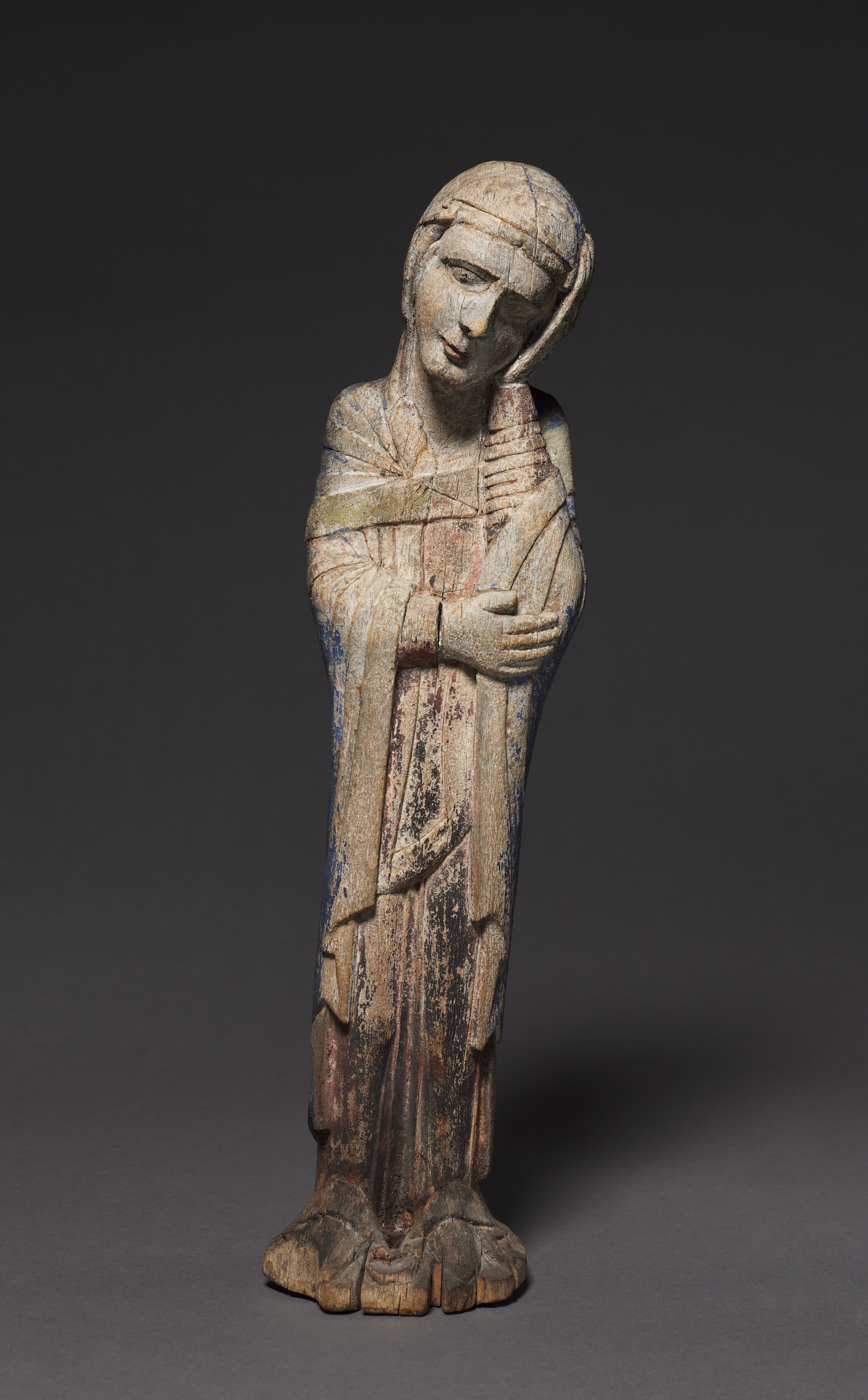 The Mourning Virgin by an unknown artist. The statue depicts a woman with her head tilted to one side. The woman has a long-sleeved dress on and her arms are crossed over her chest. The woman has a head covering and her face is expressionless. The statue appears to be made of stone or wood and is weathered with age. The base of the statue is flat. The background is dark grey.