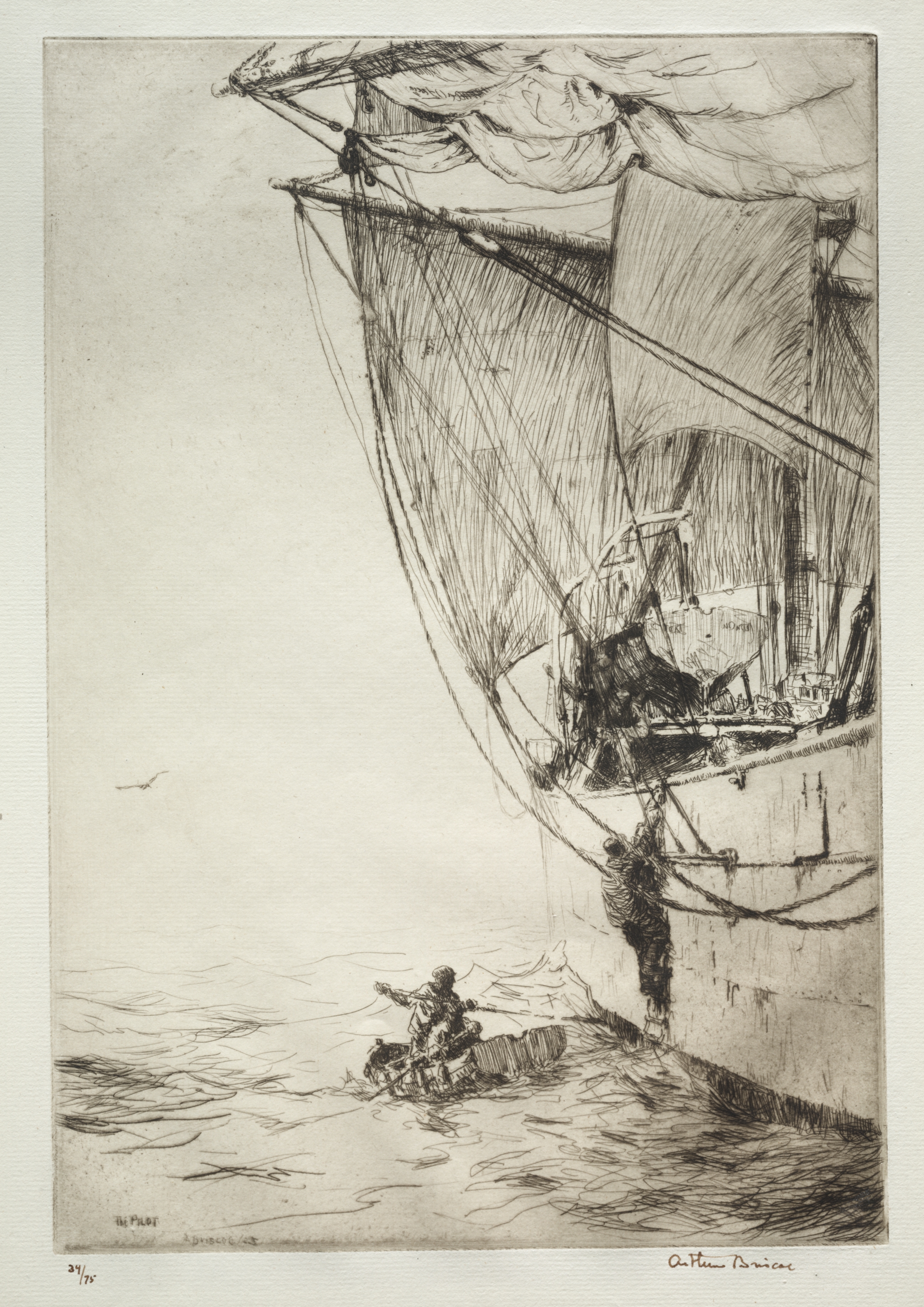 Black and white drawing of a ship on the water. A man is in a small boat near the ship. The ship's sails are up. The ship is on the right side of the image. The man is on the lower center. The water is lightly rippled. A bird flies on the left. The artist's signature is on the bottom right. The title of the piece is on the bottom left.