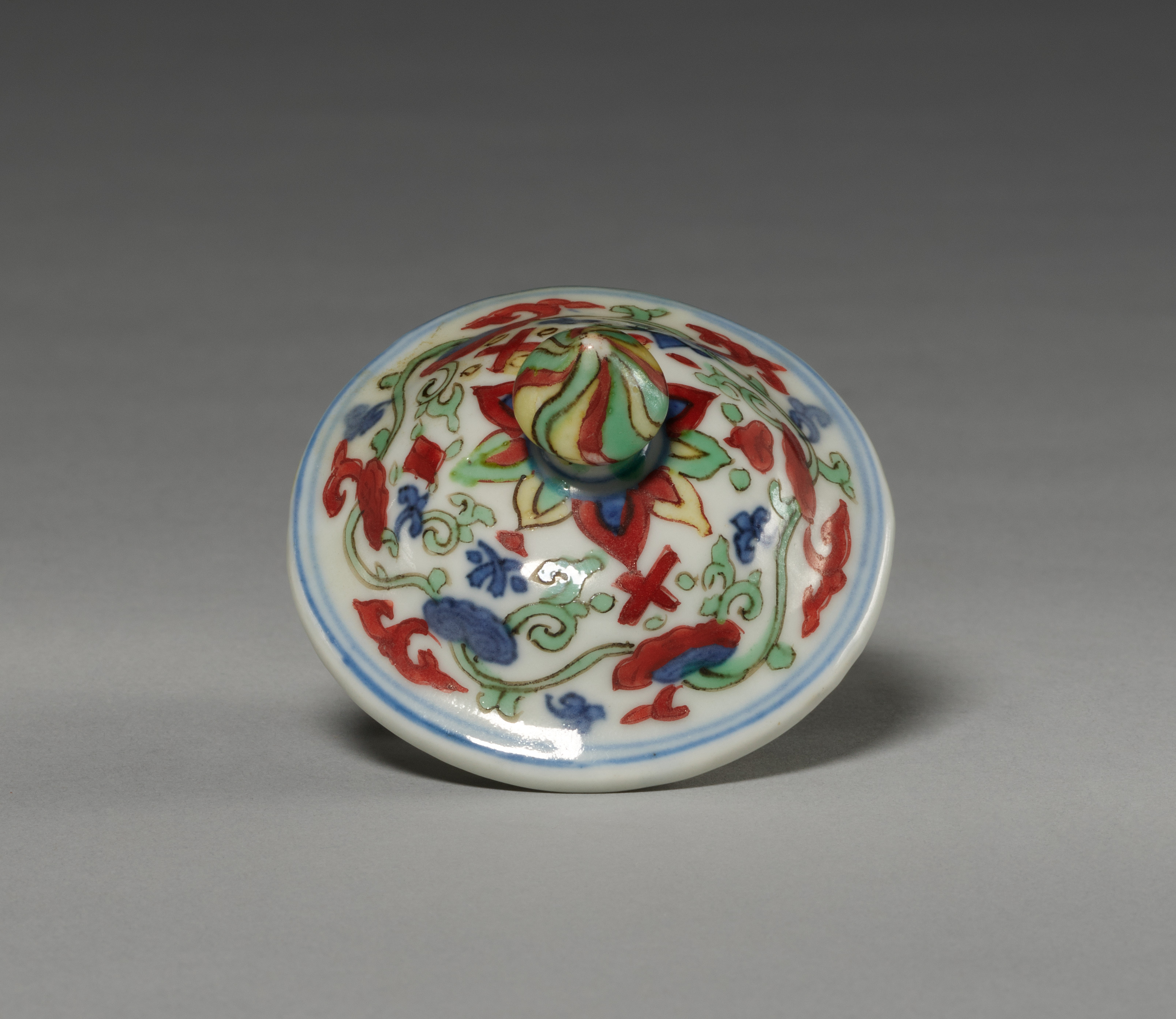 White ceramic lid with a colorful floral design, featuring red, blue, green, and yellow hues. The lid has a small knob on top and a blue border around its edge. The design includes flowers and vines. The background is a gray gradient. The artist is unknown. The title is "Covered Jar (lid)".