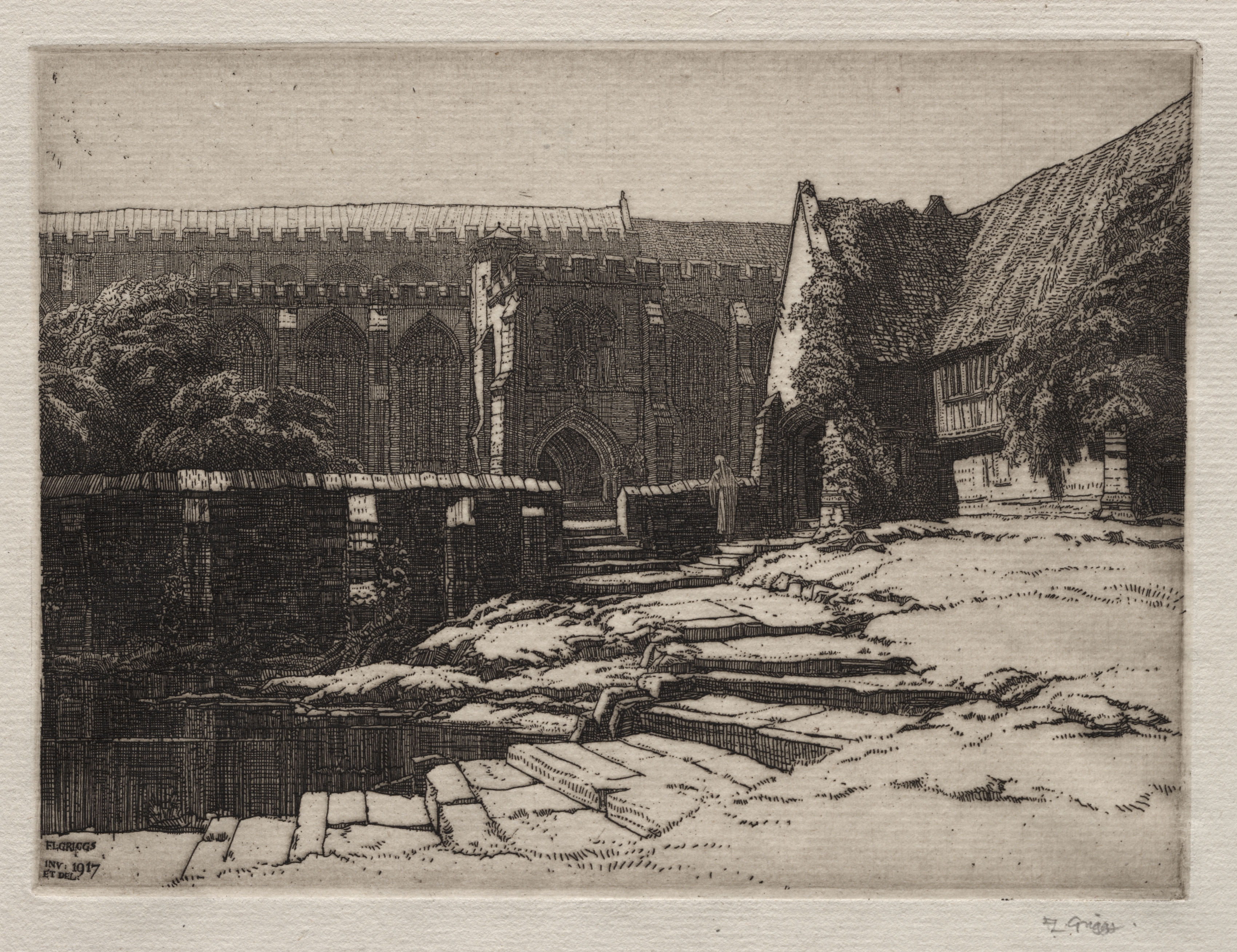 Sellenger by Frederick Landseer Maur Griggs: The image shows a black and white drawing of a stone building. The building has a long wall with several windows. The ground in front is covered in stone slabs. There are trees on either side of the building. A roofed structure is on the right. A signature is on the bottom left and right.
