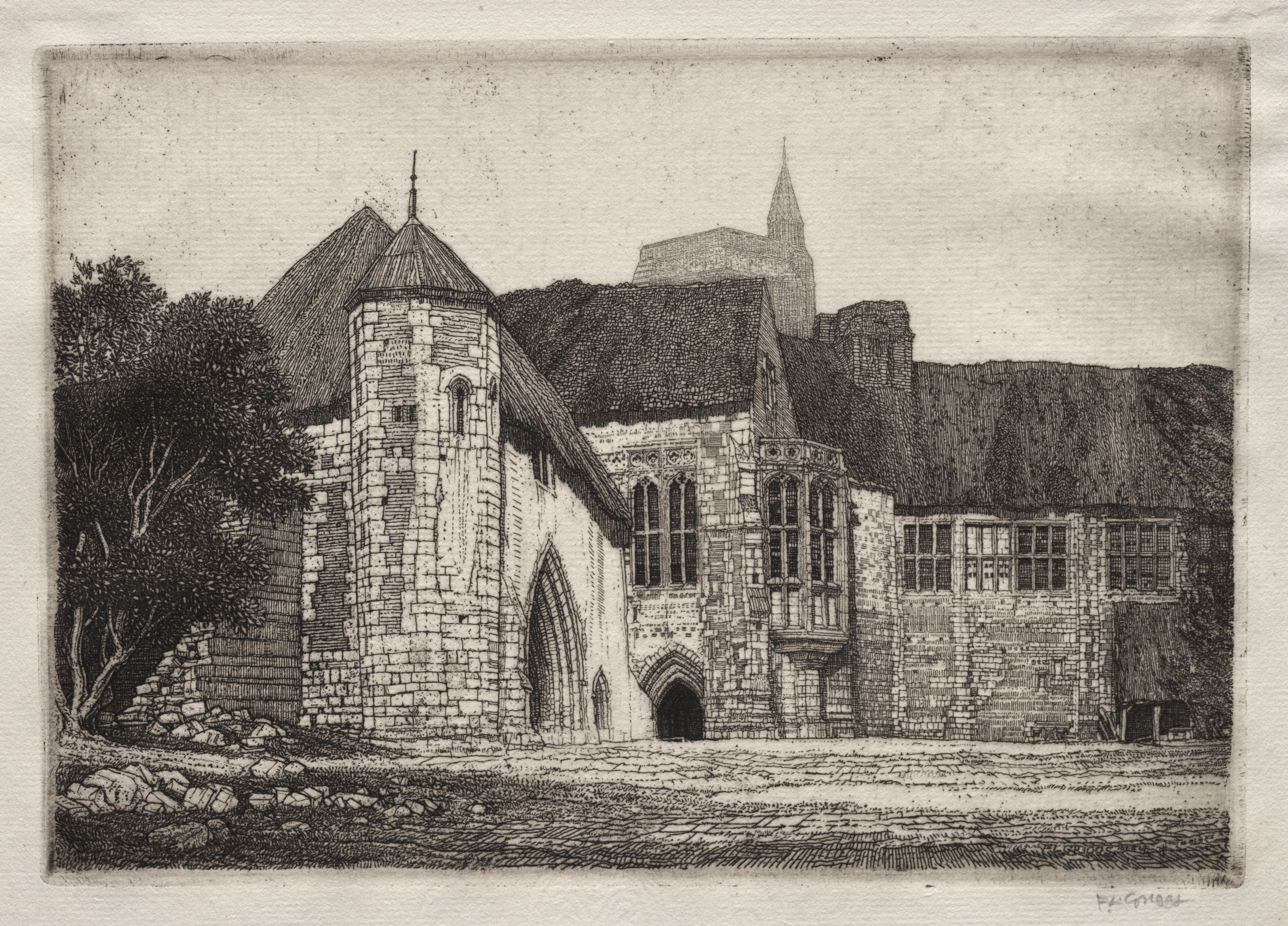 The image depicts a black-and-white drawing of a stone building, "Palace Farm" by Frederick Landseer Maur Griggs. The building has a dark roof and is made of stone bricks. A small tower with a conical roof is on the left side. The building has a large arched doorway and several windows. In the background, there are trees on the left and a church steeple rising behind the building's roof. The sky above is light-colored. The artist's signature is in the bottom-right corner. The drawing is on a textured surface, possibly paper or cardstock, with a rough border around the image. The overall scene depicts a rural or countryside setting.
