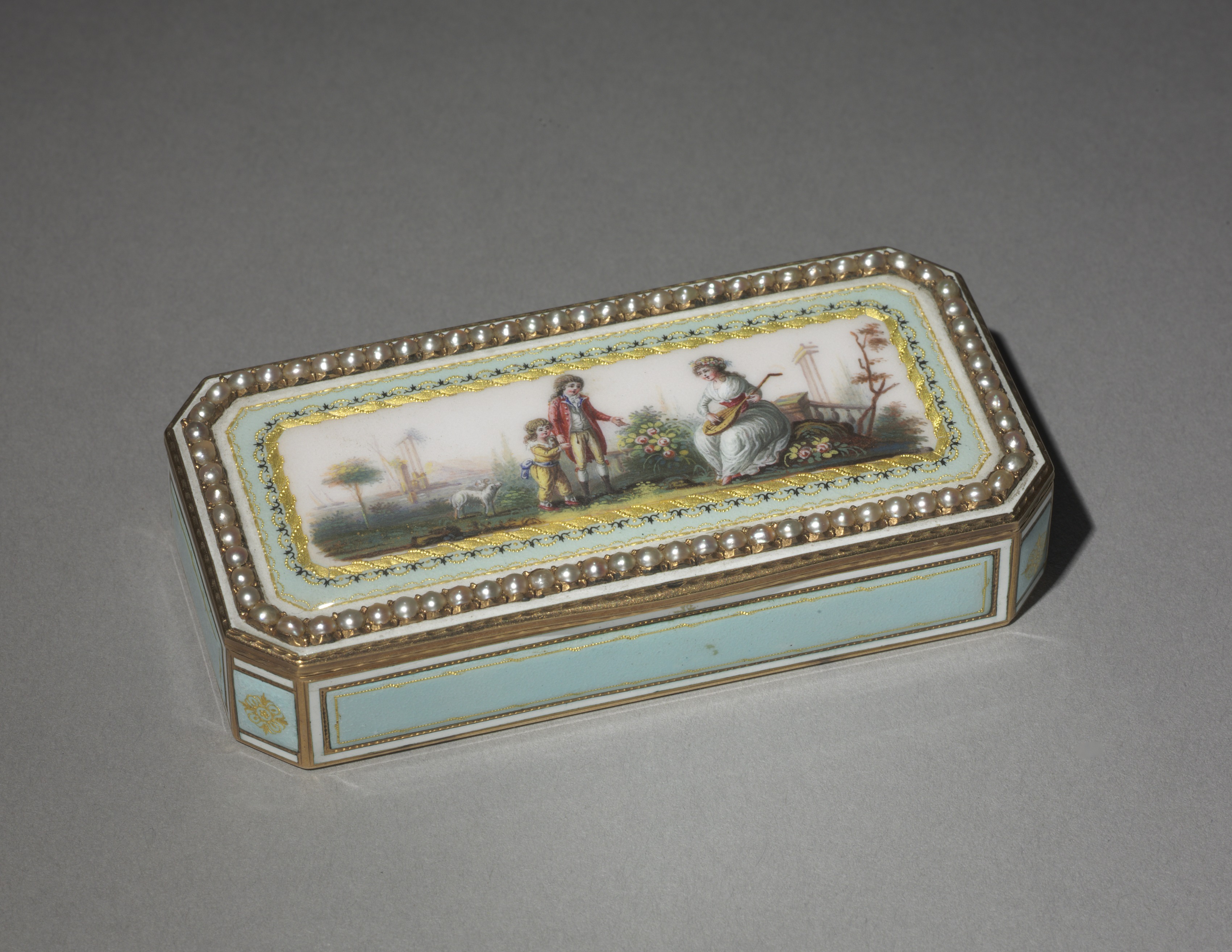 Snuff Box by artist. Rectangular box with rounded corners and octagonal shape. Top surface features a scene with a man, woman, and child in 18th-century attire, surrounded by gold and blue borders, and a pearl-like beaded edge. The box has a light blue base with gold accents and a white background. The scene on top depicts a man in a red coat, a woman in white, and a child in yellow, set against a garden backdrop with a goat. The box is set against a gray background.