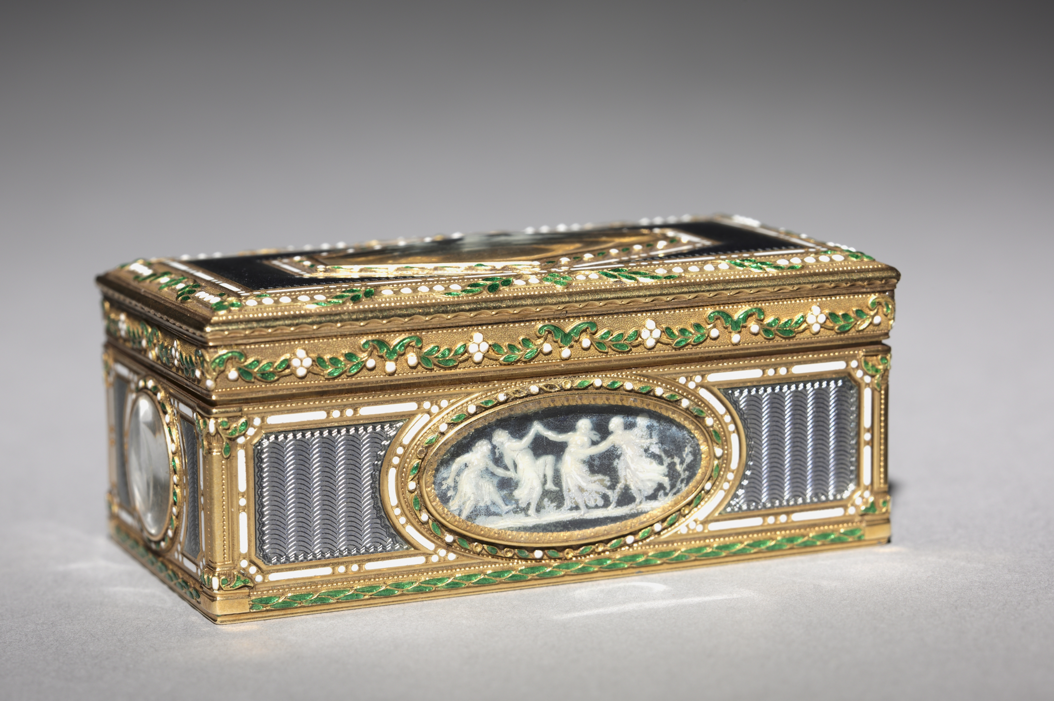 Gold-colored snuff box with a rectangular shape and flat top. The box features a green and white enamel design around the edges. There are three oval and two round clear panels on the sides and front. The front panel depicts three white figures on a black background. The top has a black panel surrounded by a gold border. The box sits on a gray surface with a gray background.