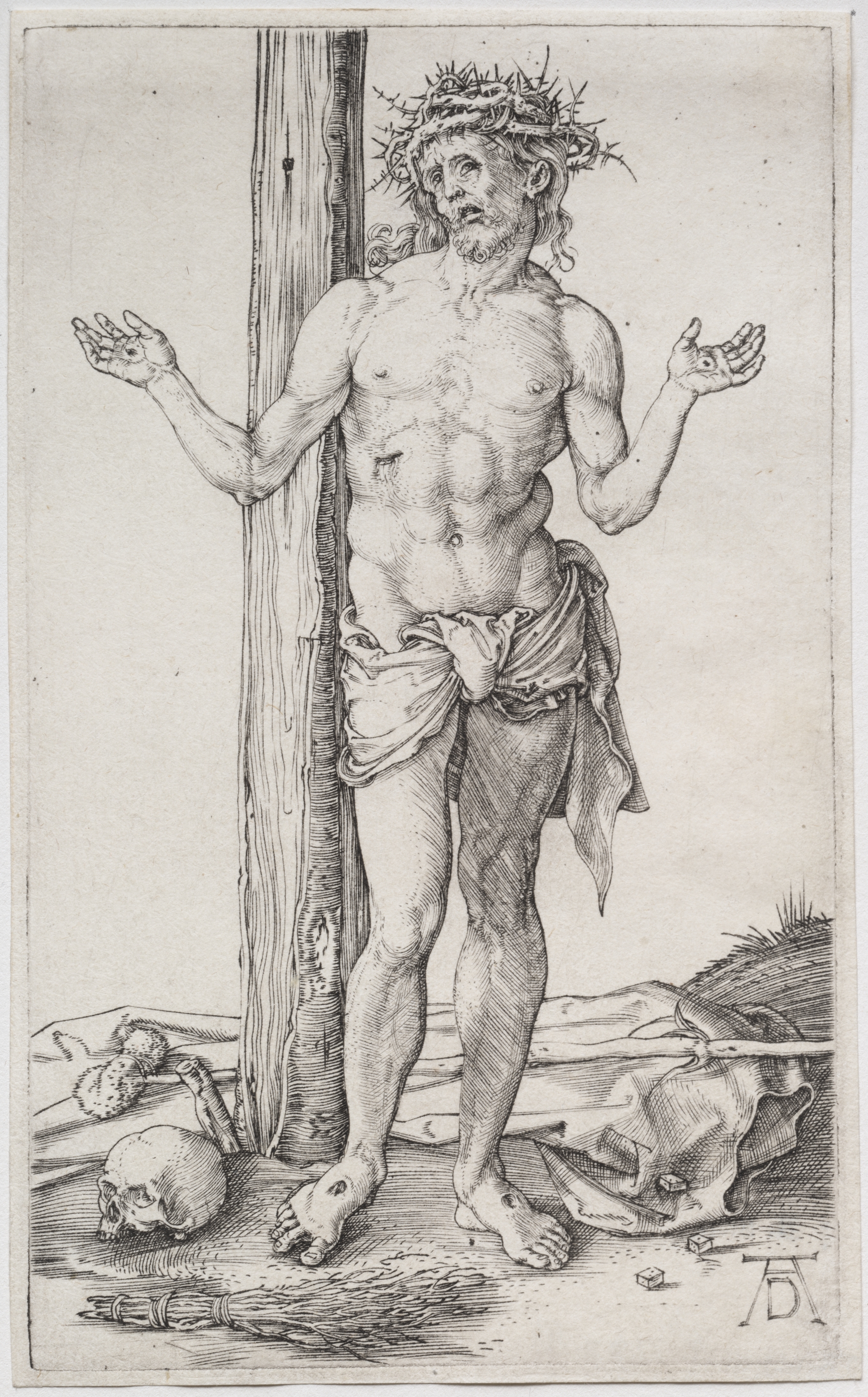 The Man of Sorrows standing with a crown of thorns on his head, wearing a cloth wrapped around his waist. His arms are raised, palms up. He stands barefoot next to a vertical wooden post. A skull and a bundle of sticks are on the ground to his left. His right hand has a wound with blood. The background shows a landscape with rocks and grass. The image is in black and white.