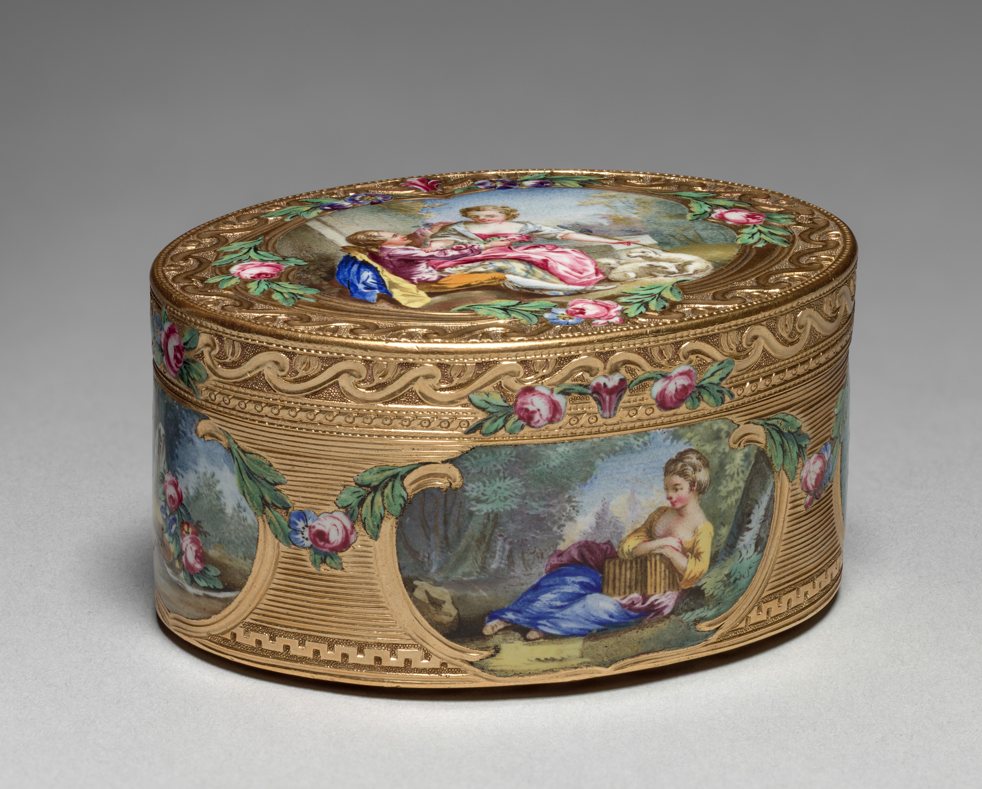Gold snuff box with a rounded rectangular shape. The lid features a painting of a woman reclining on a lawn. The woman on the lid wears a pink and white dress and has fair hair. The woman on the body of the box wears a blue and pink dress and a yellow shawl, sitting on a lawn. The box has a gold filigree pattern around the lid and body. The box is decorated with floral motifs around the lid and body. The floral motifs include pink and blue flowers, green leaves. The box has a ribbed body. The background of the image is grey.